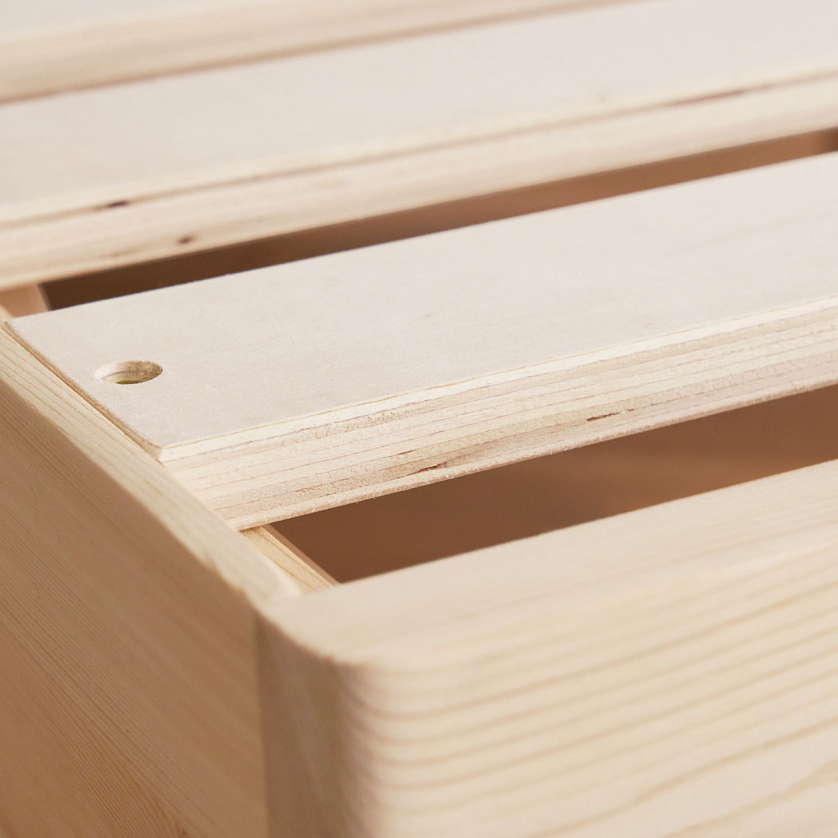 ベッド下のスペースは高さ25cmまでの収納ケースが入る。