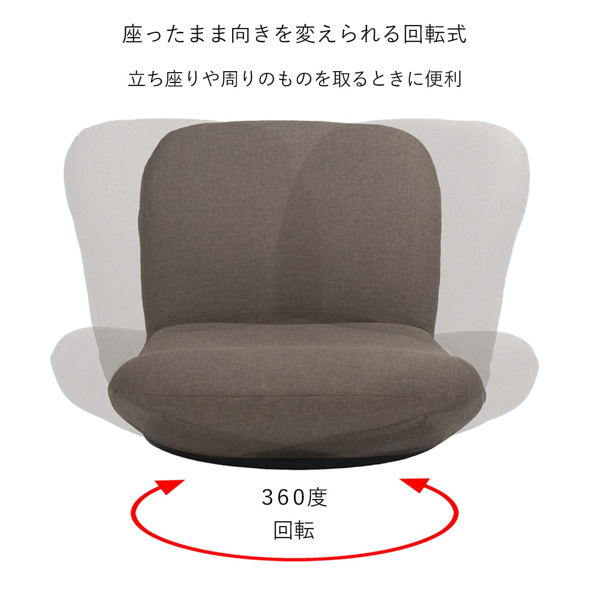 産学共同研究によるデータをもとに開発した、独自ウレタン積層構造のローバック座椅子です。シンプルなデザインで、こたつやローテーブルにもぴったり。座面下に回転盤を設けた360度回転式で、座ったまま向きを変えられます。
