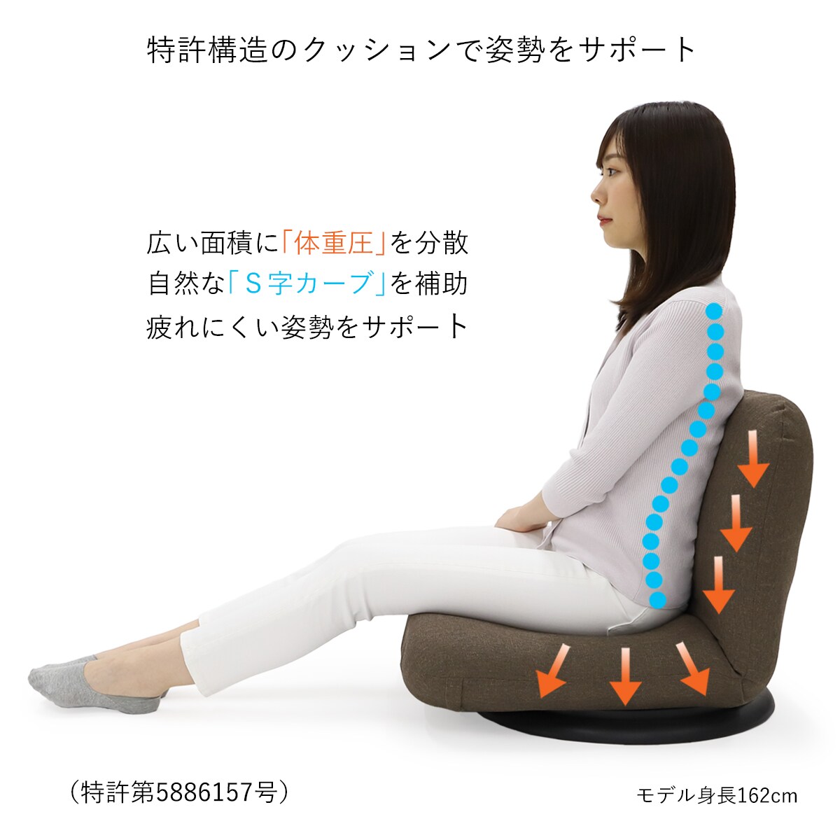 産学共同研究によるデータをもとに開発した、独自ウレタン積層構造のローバック座椅子です。シンプルなデザインで、こたつやローテーブルにもぴったり。座面下に回転盤を設けた360度回転式で、座ったまま向きを変えられます。