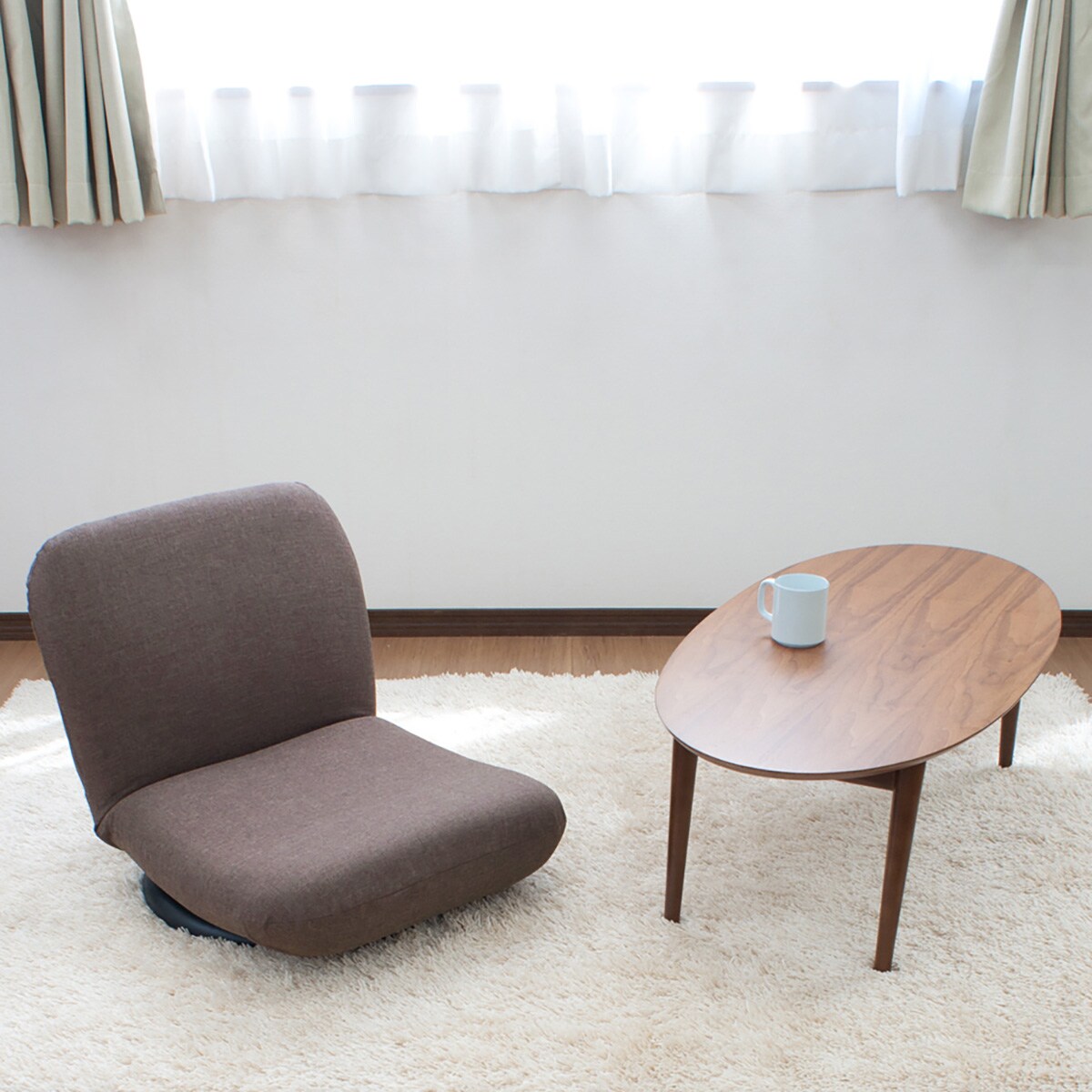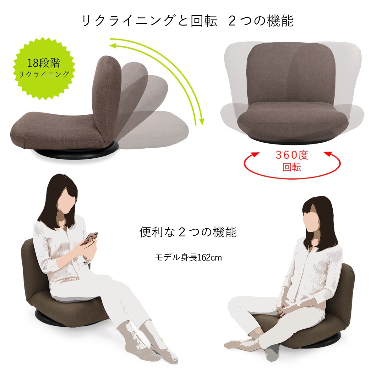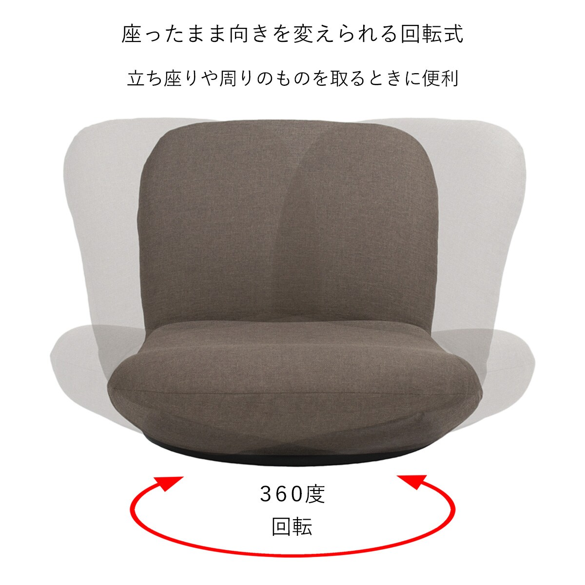産学共同研究によるデータをもとに開発した、独自ウレタン積層構造のローバック座椅子です。シンプルなデザインで、こたつやローテーブルにもぴったり。座面下に回転盤を設けた360度回転式で、座ったまま向きを変えられます。