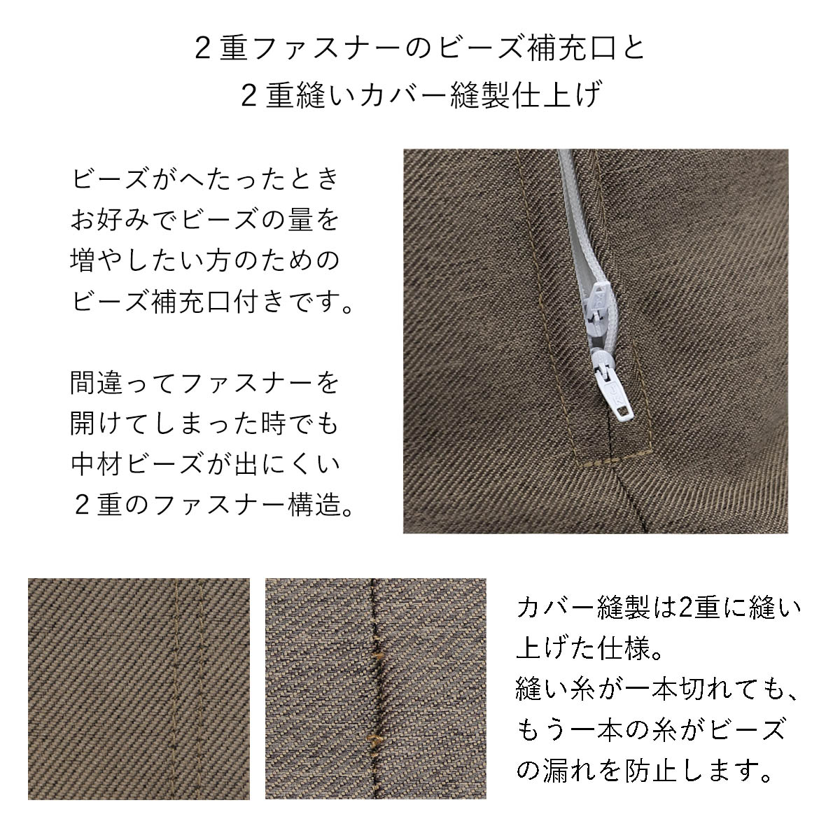 カバーは2重縫い仕上げで中材のビーズが飛び出しにくい構造。