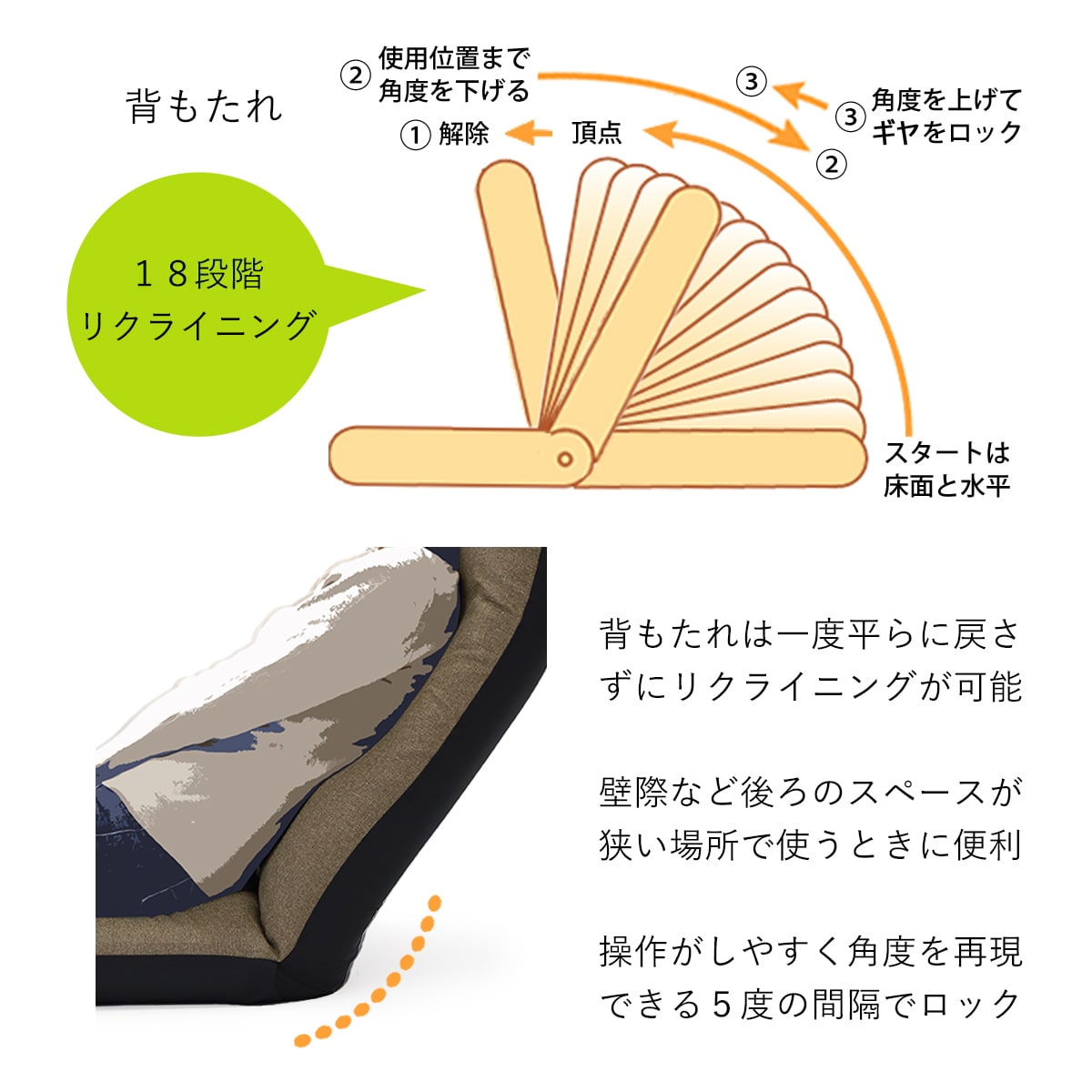 場所をとらない扱いやすいサイズの日本製ヘッドリクライニング座椅子です。こだわりのウレタン構造と頭部・背もたれの2ヵ所のリクライニング機能でくつろぎの姿勢をサポートします。