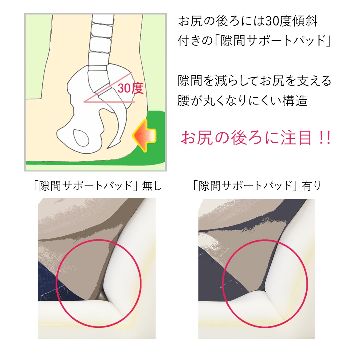 30度傾斜付きの隙間サポートパッドで腰とお尻を支えます。