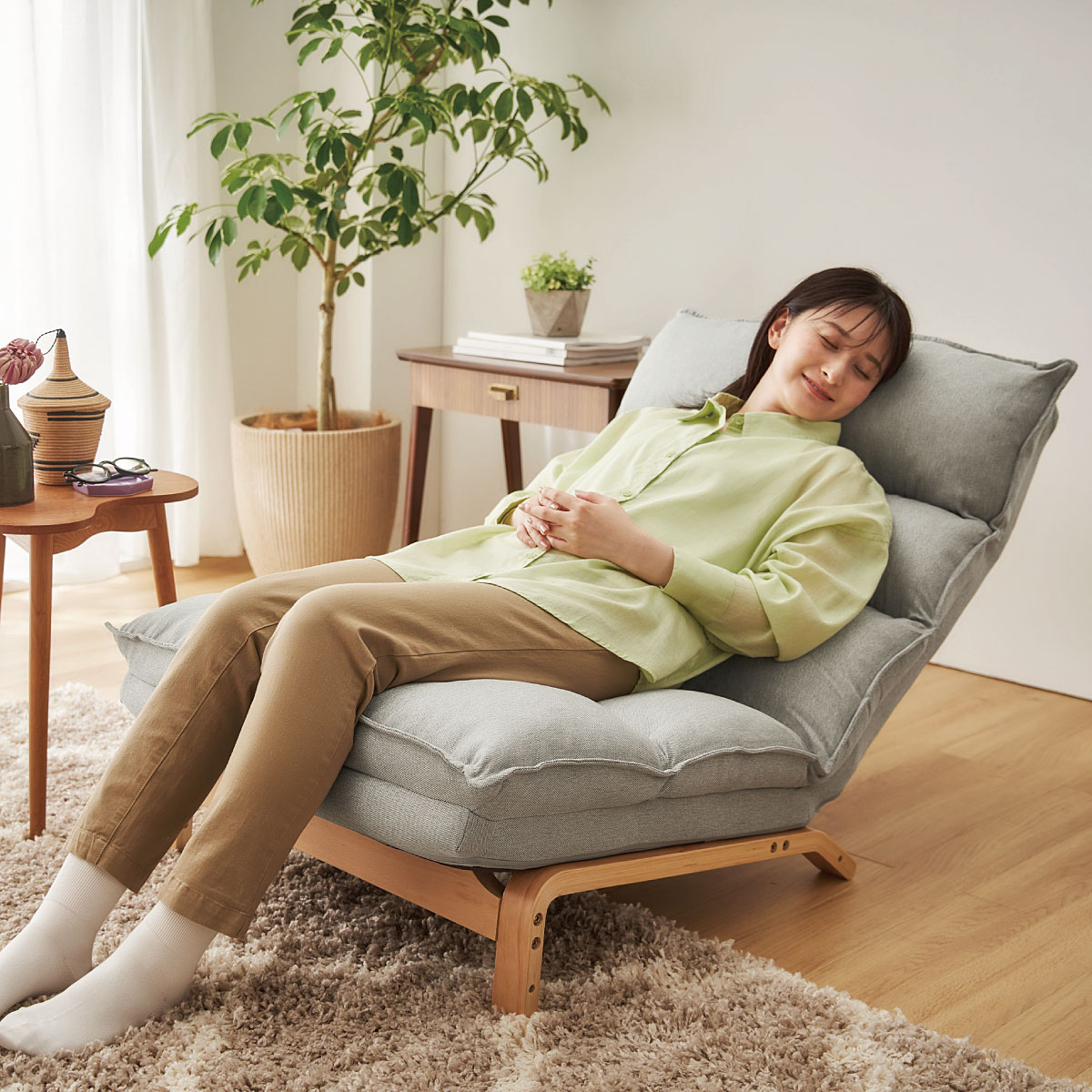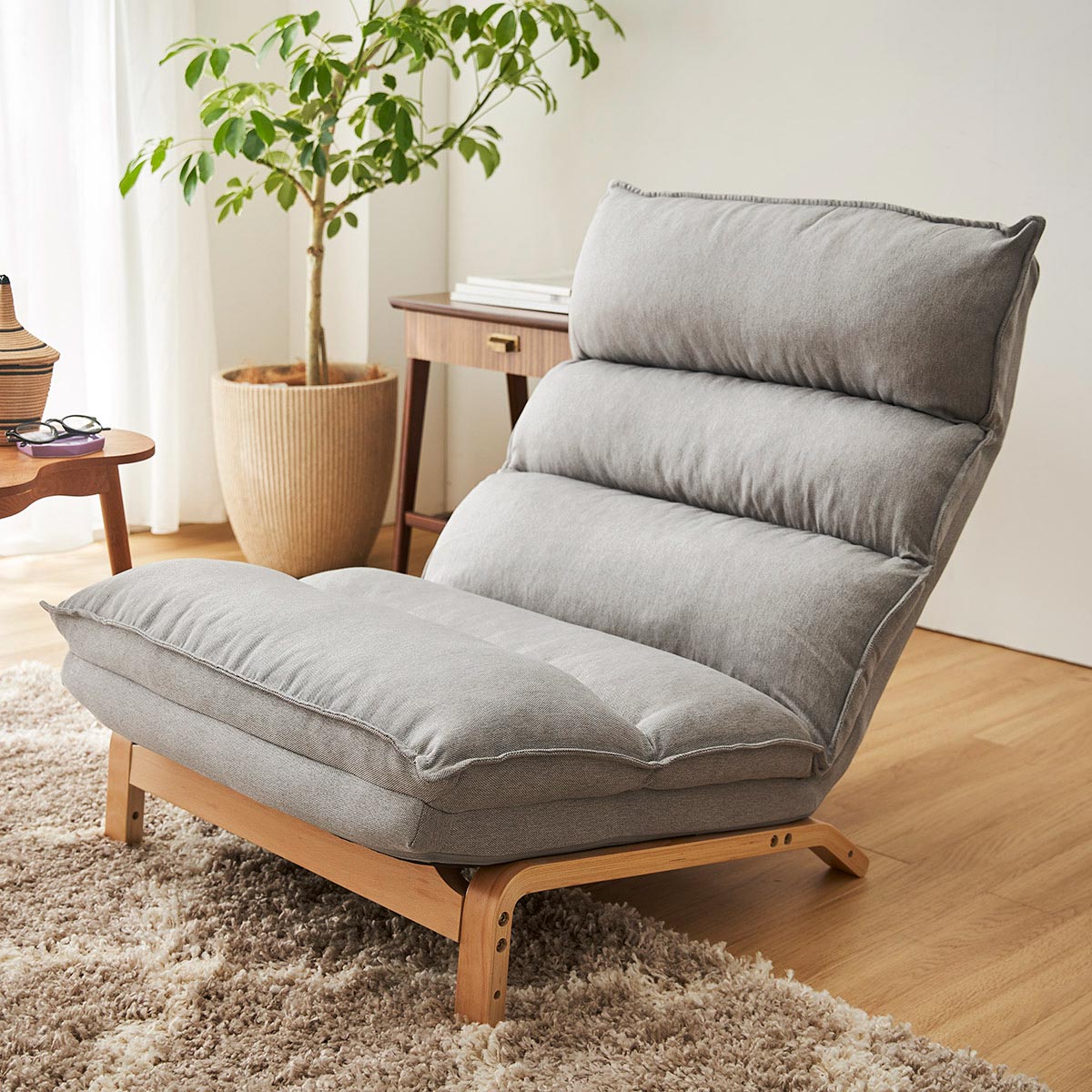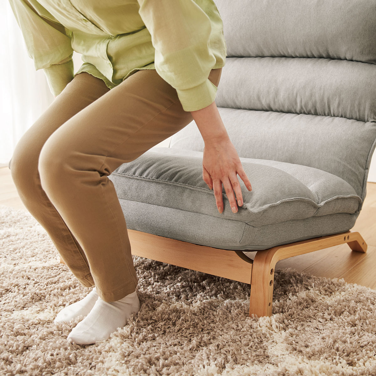 ボリュームたっぷりな極厚クッションが快適。贅沢サイズのひとり掛けソファです。背部と頭部はリクライニング仕様なので、お好みの角度に調整していただけます。木脚付でインテリアに馴染むナチュラルなデザインも魅力的。程よい高さで立ち上がりやすいのも嬉しいポイント!ネジで連結すると二人掛けのソファになります。