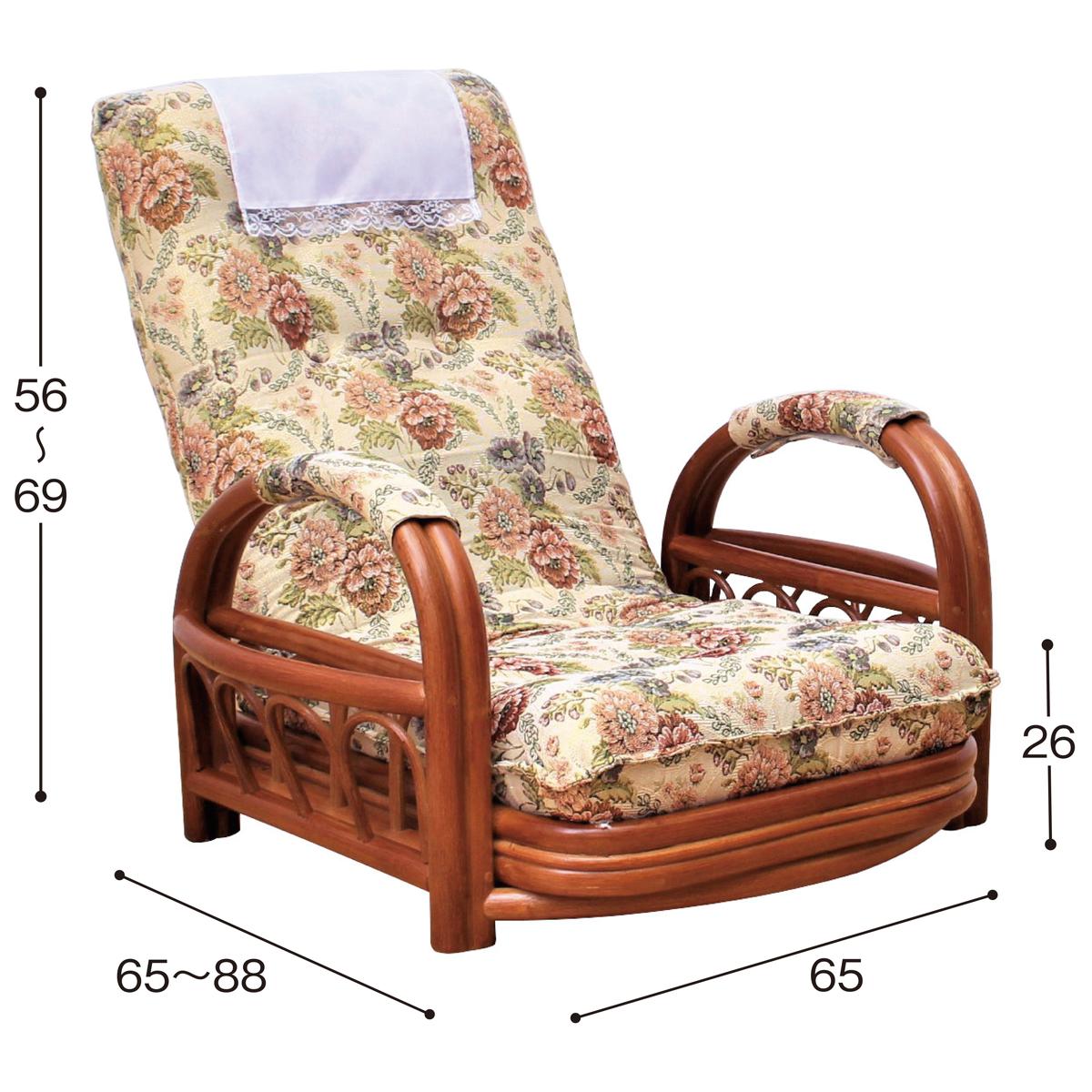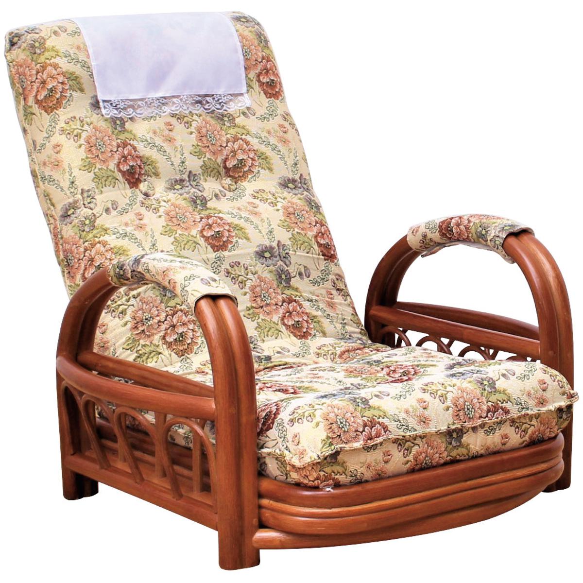天然籐の自然な風合いとゴブラン調の華やかさが調和した、上品で落ち着きのあるリクライニング座椅子です。360℃回転と肘掛け付きで立ち上がりもラクラク。3段階のリクライニング機能でお好みの姿勢でくつろげます。ヘッド部は洗えるカバー付き。面テープで簡単に着脱できます。両サイドには雑誌などを収納できるポケット付き。日常のくつろぎ空間に贅沢な癒しをもたらします。