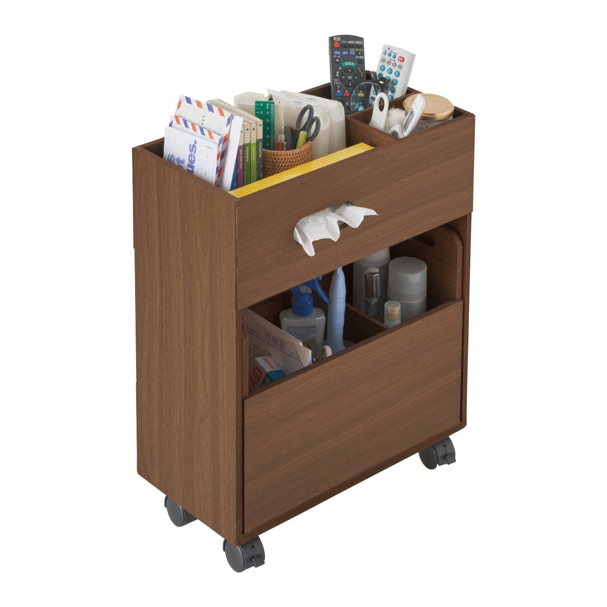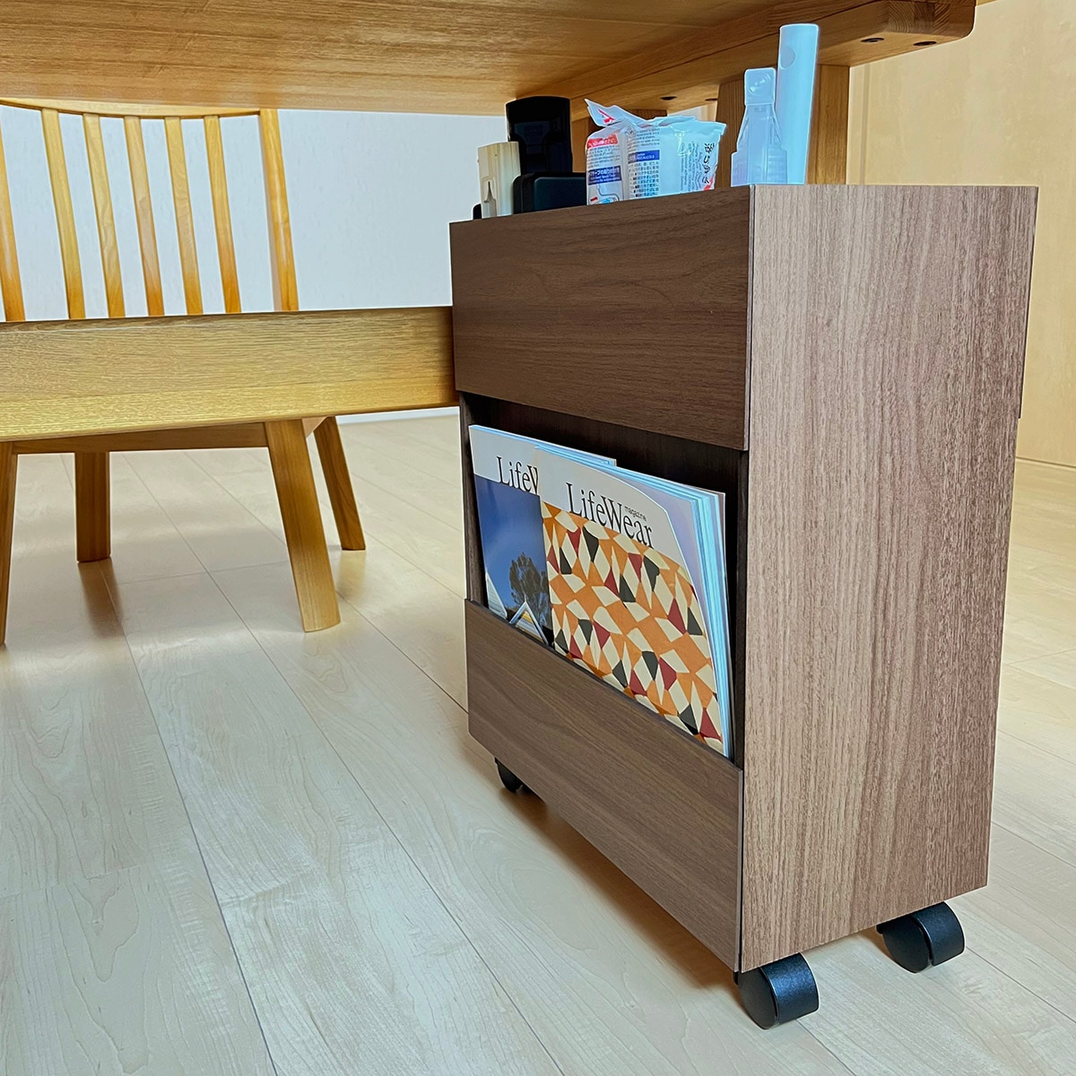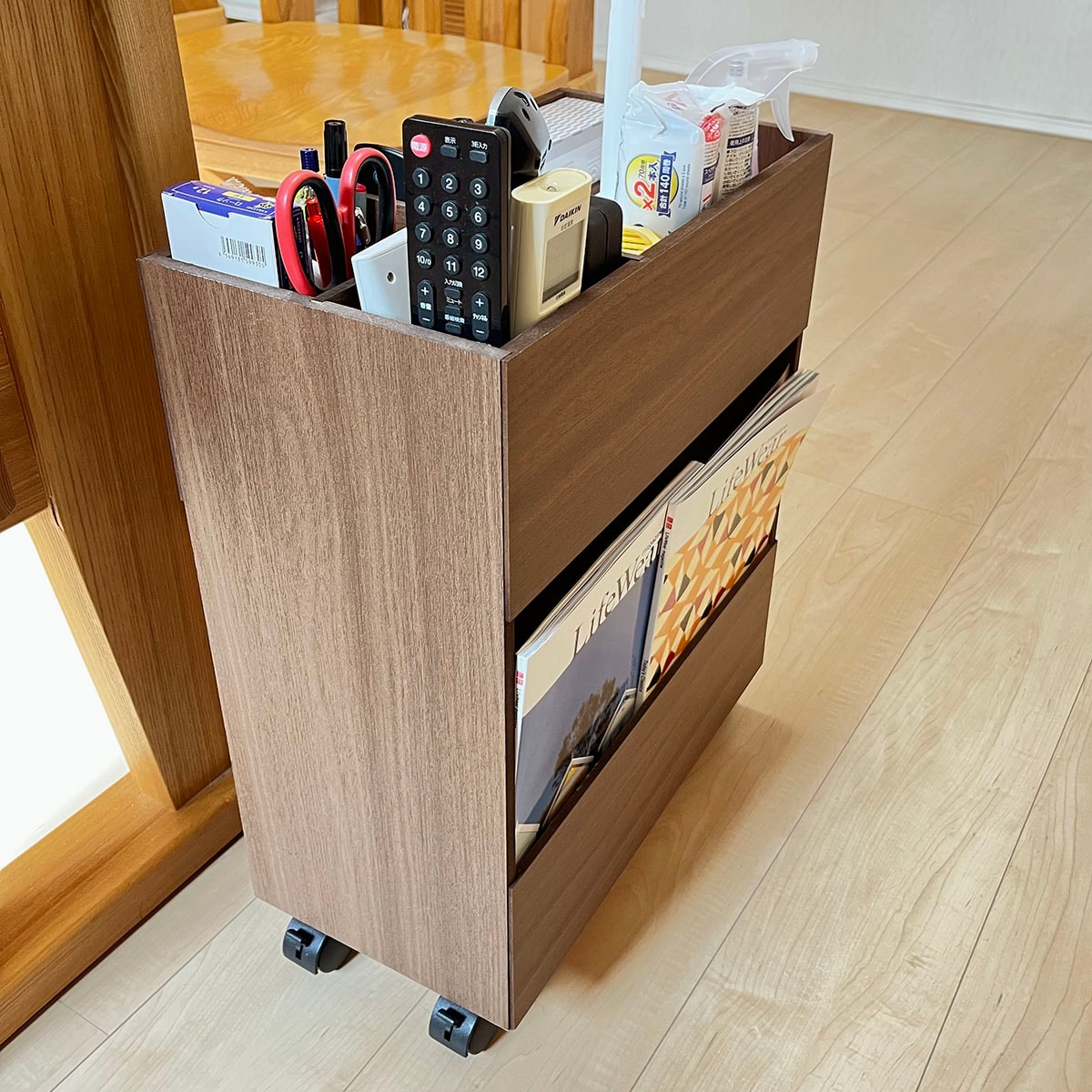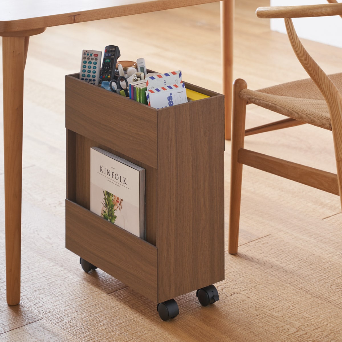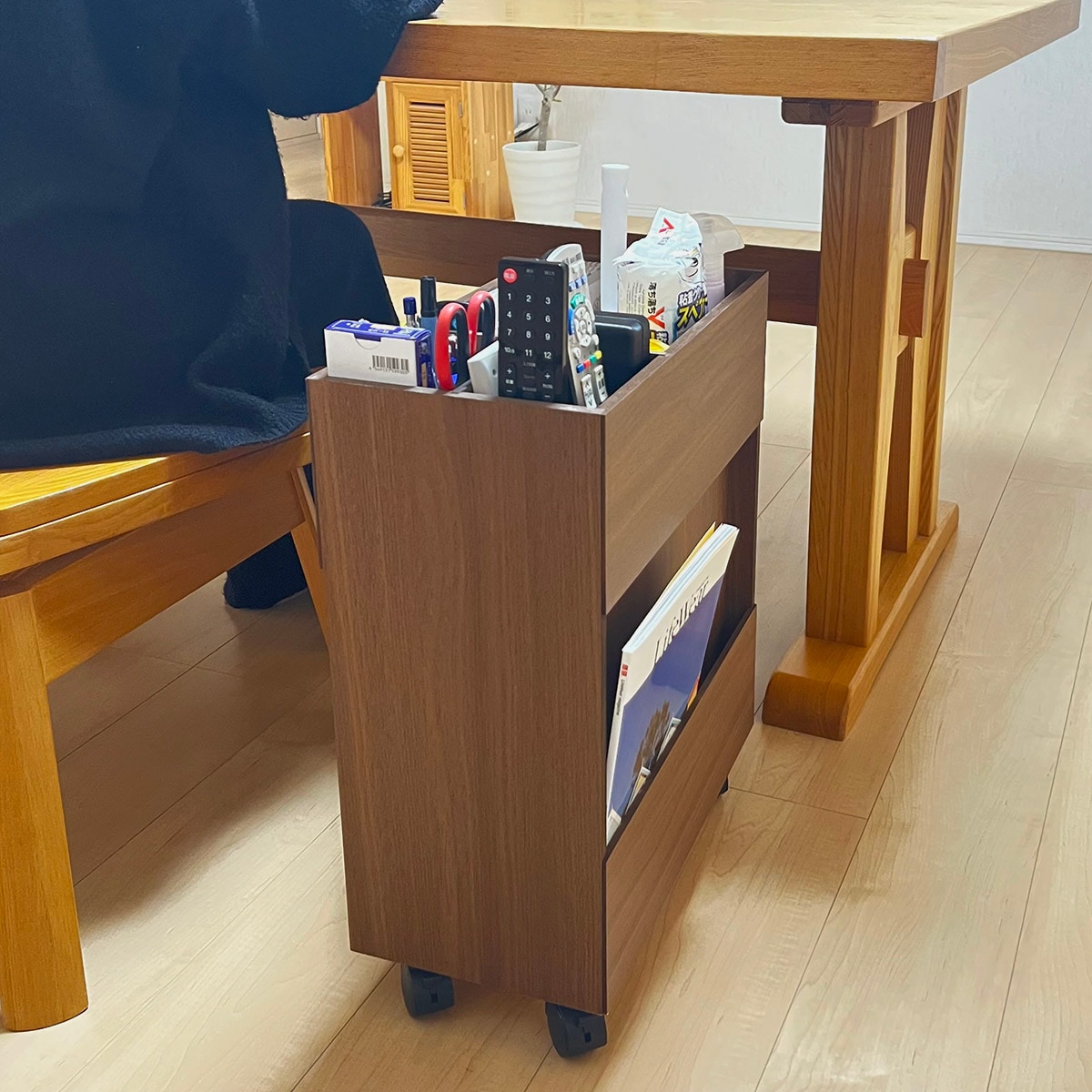あれどこ行った? を解消! 散らばる小物をすっきり収納できるスリムワゴンです。ダイニングテーブルの下やソファサイドに置けば、よく使うものをすぐそばに収納できて便利!