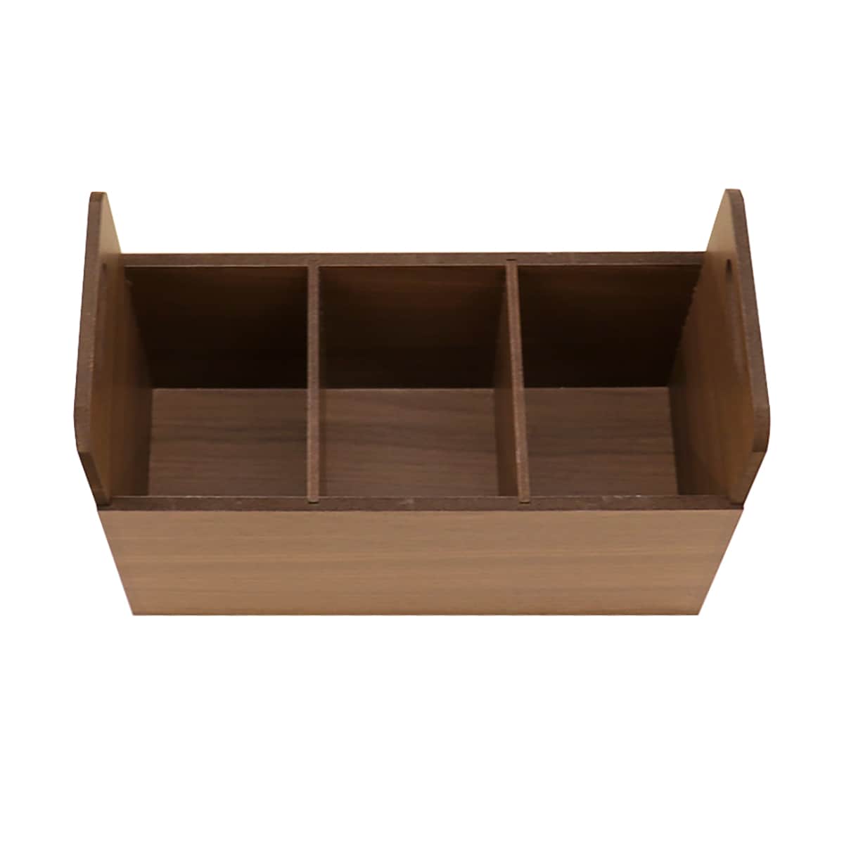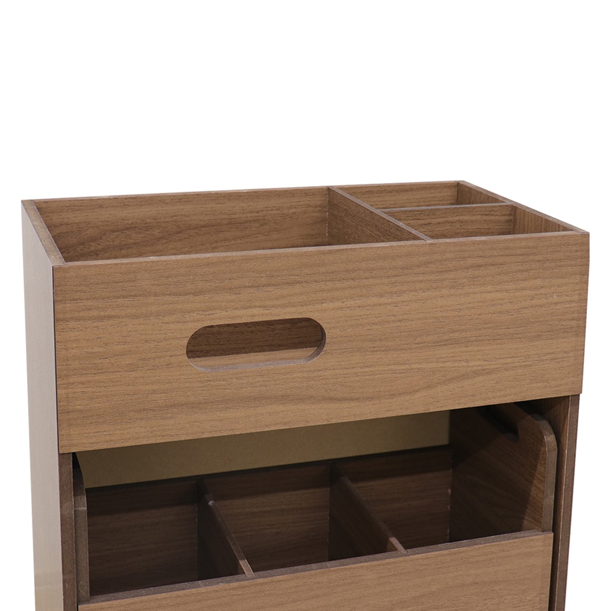 細々した小物をひとまとめにできる収納ワゴンです。ダイニングテーブルの下にすっきり収まる、場所を取らないスリムタイプ。トップが開けているので、収納物が見やすく取り出しやすい! 面倒な探し物をする手間が省けます。上段の仕切りは取り外し可能なので、収納物に応じて自由に変更可能。下段のトレーも取り外せるため、好きな場所に持ち運びできて便利。ティッシュケースも収納できるのもうれしいポイント。背面は新聞や雑誌が収納できるブックエンド仕様。キャスター付きで移動もラクラク! インテリアになじむ木目調のデザインです。