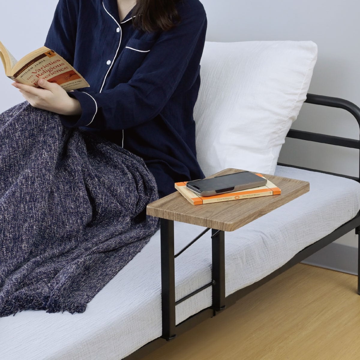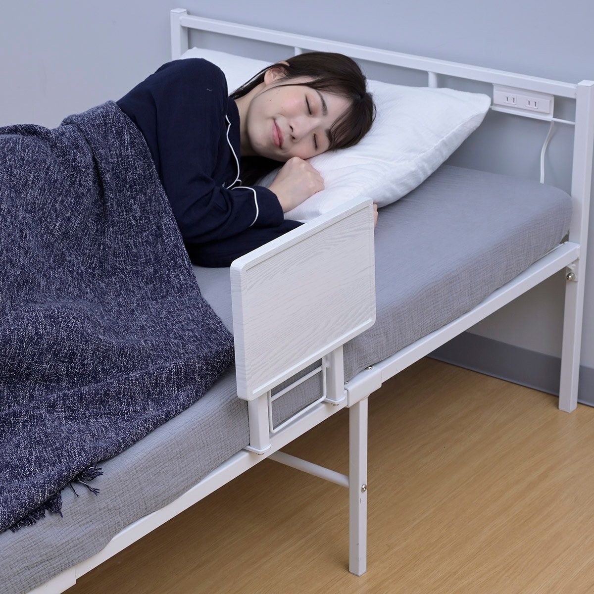 布団のズレ落ち防止に!ちょい置きに便利な折りたたみ棚付きのベッドガードです。