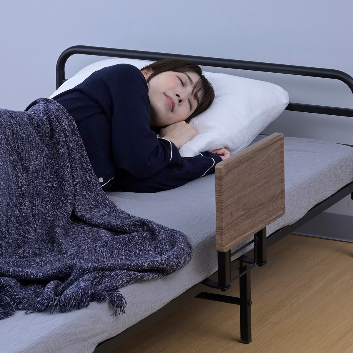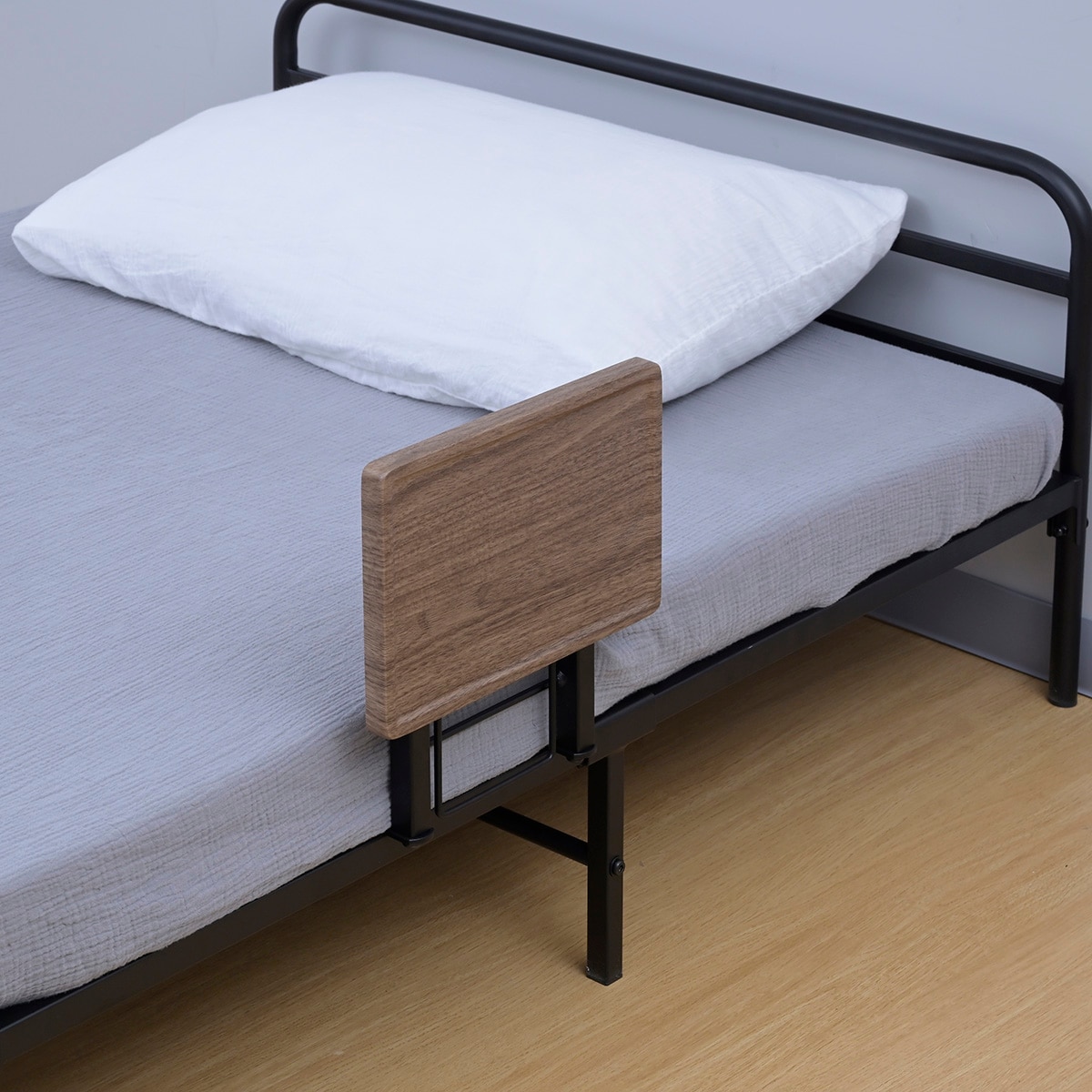 ブラウンちょい置きに便利な折りたたみ棚付きのベッドガードです。