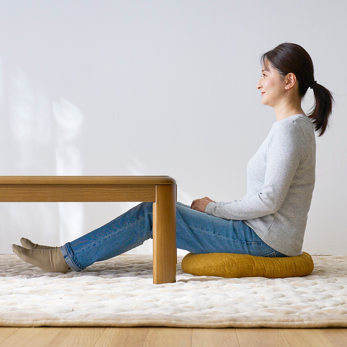 脚に天然木を使用した上品な佇まい。秋冬はこたつとして使用し、春夏のオフシーズンもテーブルとして使えます。継ぎ脚付で2段階の高さ調整が可能です。天板は丸みのあるラウンド加工。