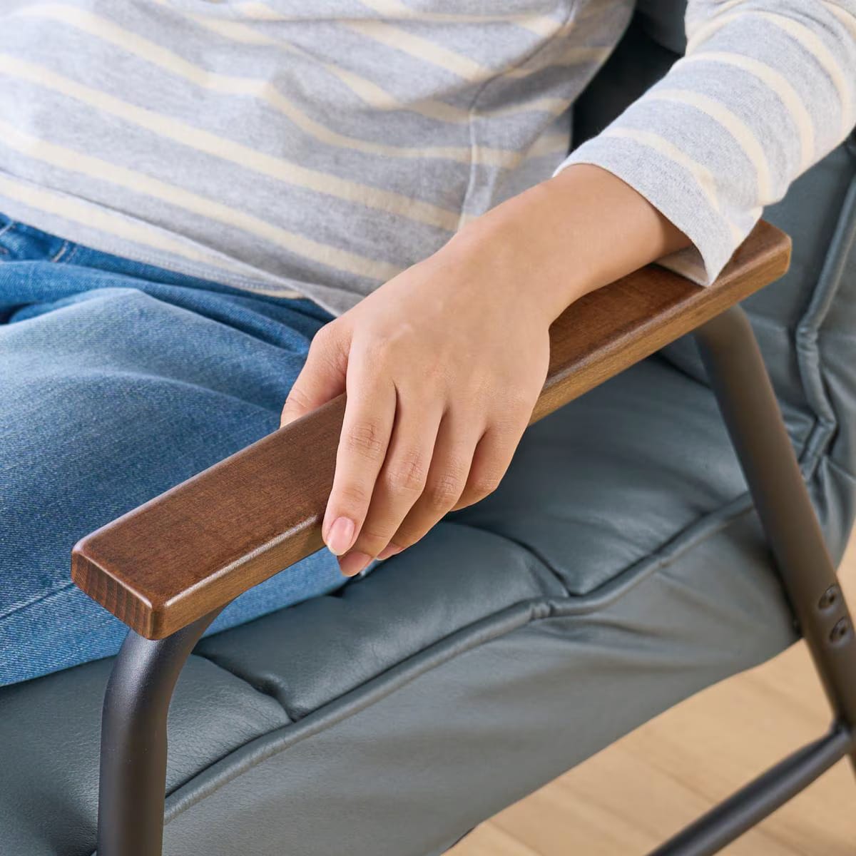 グレー肘掛け付きで立ち座りがラク。