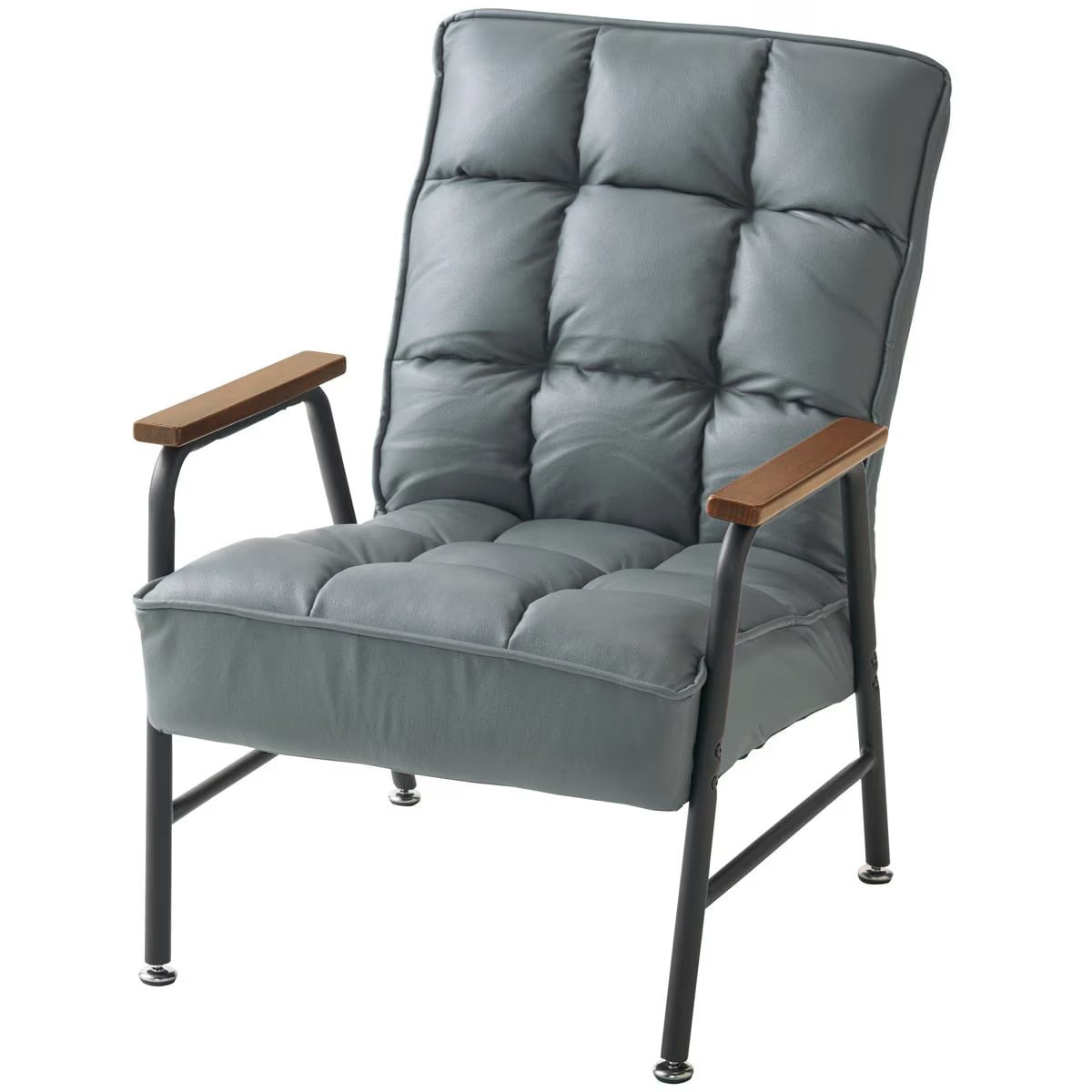 座面にポケットコイルを使用。独立したコイル1つ1つが体の曲面にぴったりフィットするパーソナルソファチェアです。程よい柔らかさで沈み込み体圧分散します。くつろぎ方に合わせてお好みの角度に調整できる6段階のリクライニング機能付き。天然木の肘掛け付きで立ち座りしやすい!肌触りと高級感にこだわった好感触なレザー風の生地を使用。