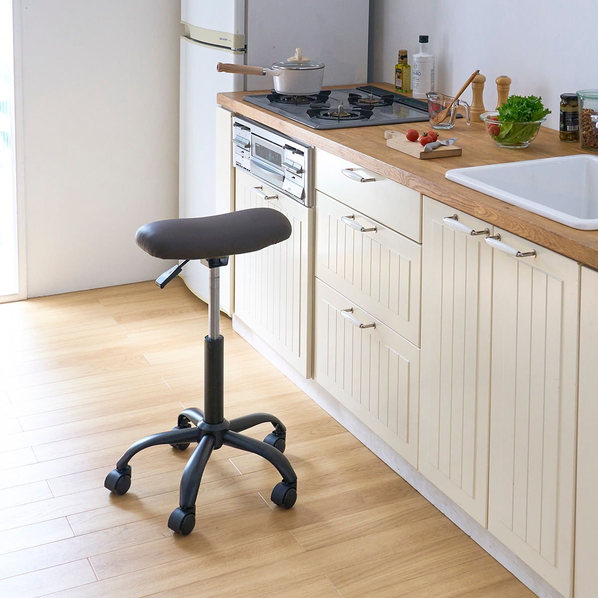 キッチンでの作業をラクラクサポートするライドチェアです。座ったままスーッと移動できるのでとっても便利!360度回転で動きやすいのもうれしいポイント。従来のカウンターチェアは作業台に脚があたって台との距離がありましたが、本品はまたがることで足があたらず台との距離が近く作業しやすくなりました。またがる姿勢によって骨盤が立ちやすく、自然と背筋が伸びるので良い姿勢で作業ができます。小回りがきくコンパクトなレッグフレームを使用しているため、狭いキッチンでも場所を取りません。