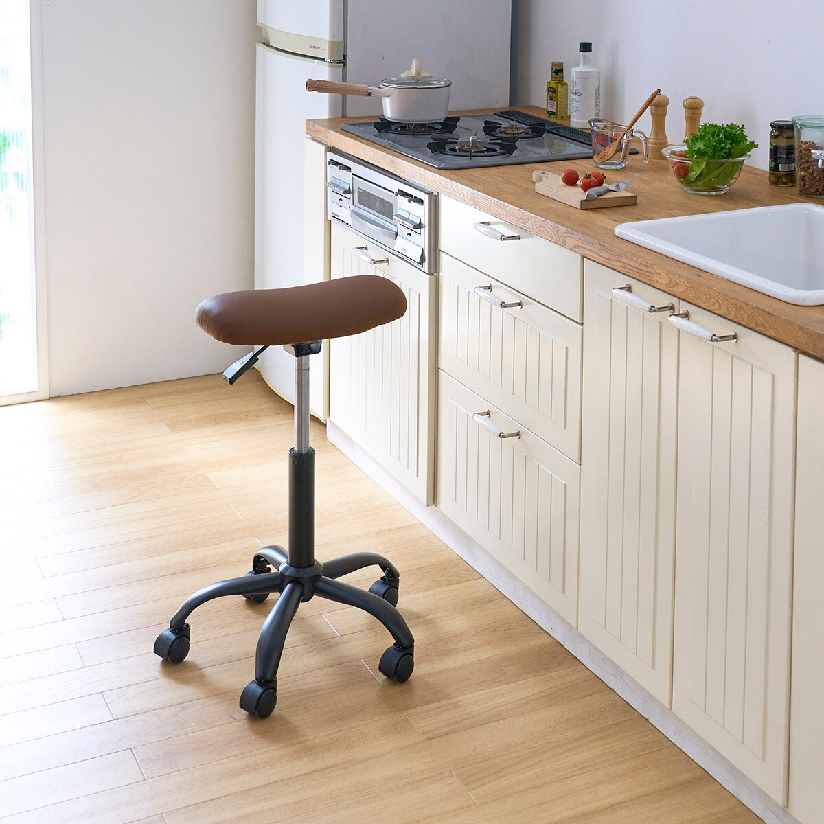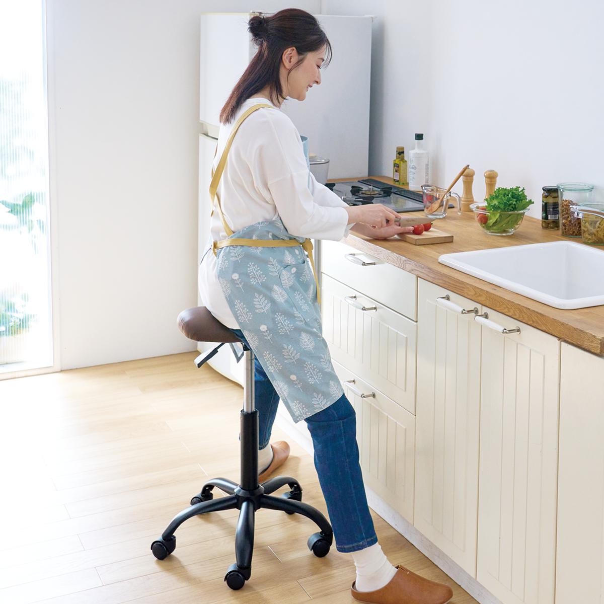 座ったままスーッと移動できるのでとっても便利! キッチンでの作業をラクラクサポートするライドチェアです。一般的なカウンターチェアはキッチンで使うと脚がつかえて作業しづらいですが、本品はまたがることで作業台との距離が近くなり、360度回転で小回りが利くので動きやすいのもうれしいポイント。またがる姿勢によって骨盤が立ちやすく、自然と背筋が伸びるので良い姿勢を保ったまま作業ができます。コンパクトなレッグフレームを使用しているので、狭いキッチンでも場所を取りません。