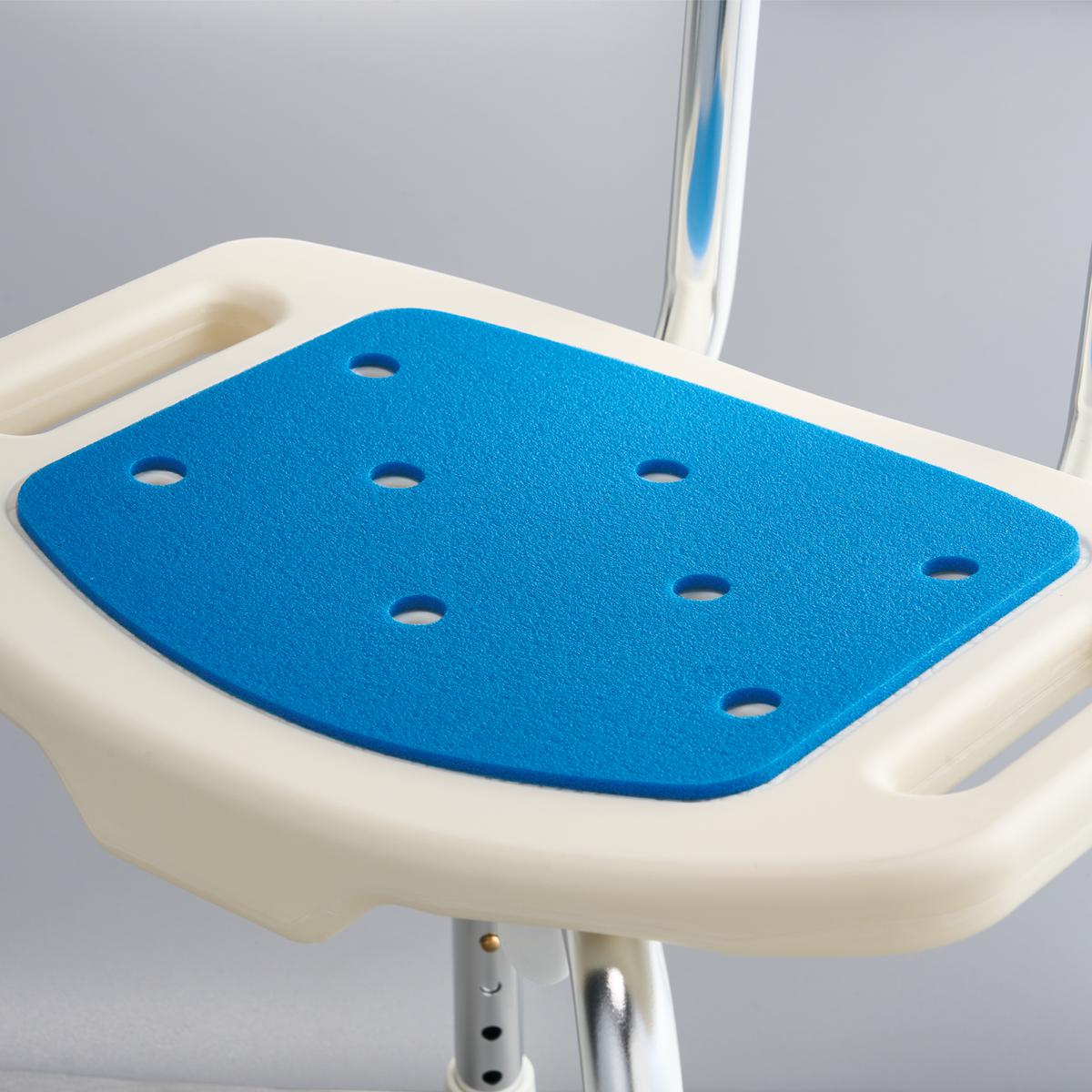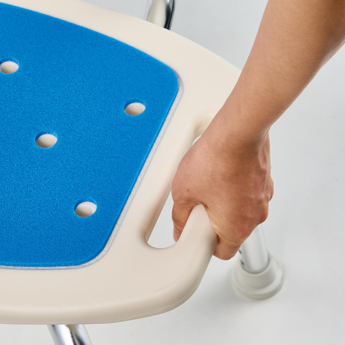 お風呂での立ち座りがラクになるシャワーチェアです。サイドには立ち上がり時に踏ん張れるように取っ手付き。ボタンを押しながらスライドさせればお好みの高さに調整できます。フレームは丈夫でさびにくいアルミ製を使用。アルミで軽いもの嬉しいポイント。脚の先はゴム製キャップ付きなので滑り止めに。座ったときにヒヤっとするのが嫌な人は取り外し可能のシール式クッションマット付。