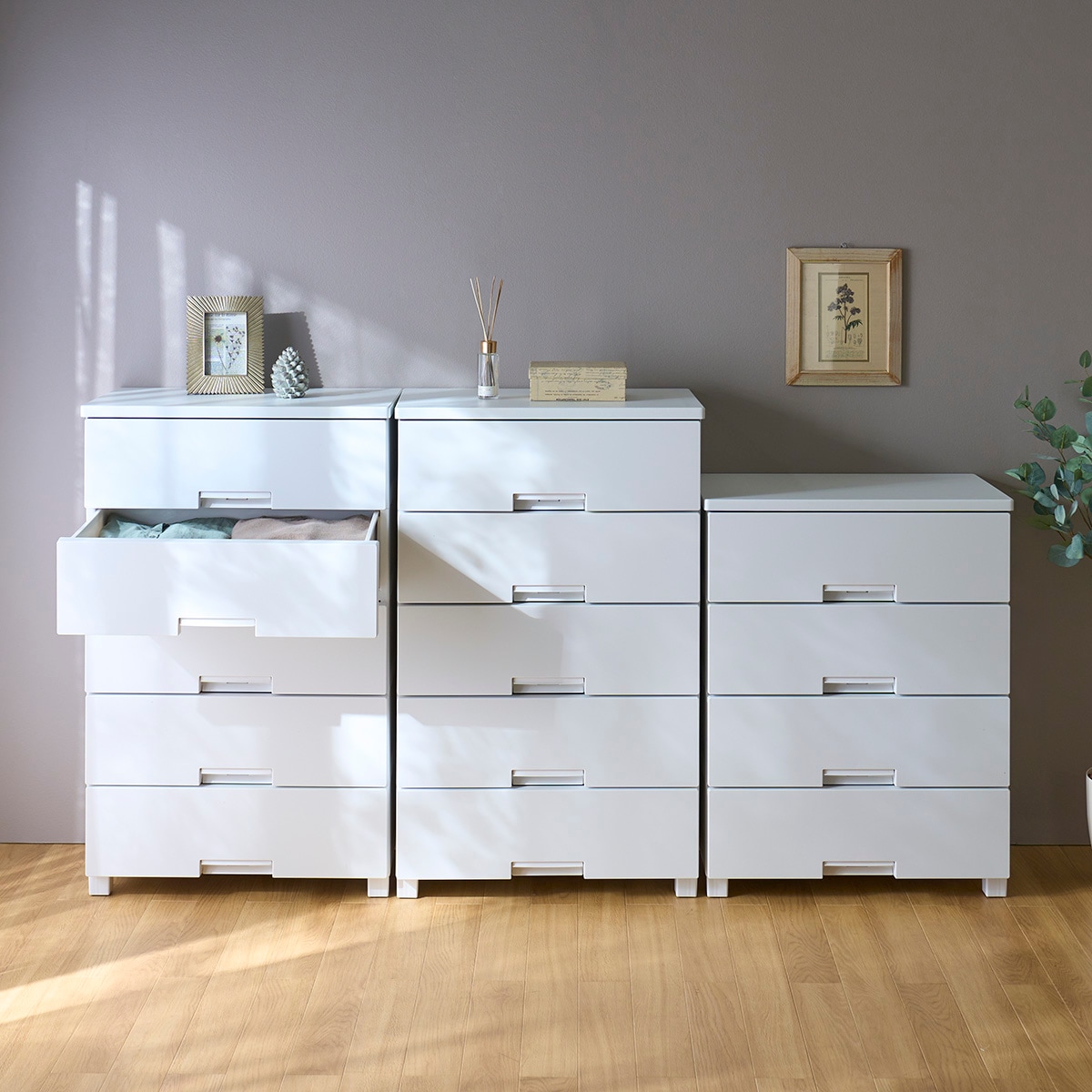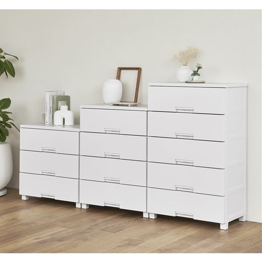 フィッツケースの機能性にインテリア性をプラスした収納チェストです。上品でスタイリッシュなデザインが清潔感を演出し、新生活にもおすすめです。引き出しにロック機能がついているので万が一本体が傾いても中身が飛び出しにくい構造。たっぷり収納しても指1本で軽く引き出せます。本体は樹脂製なのでホコリや汚れもサッと拭き取れます。