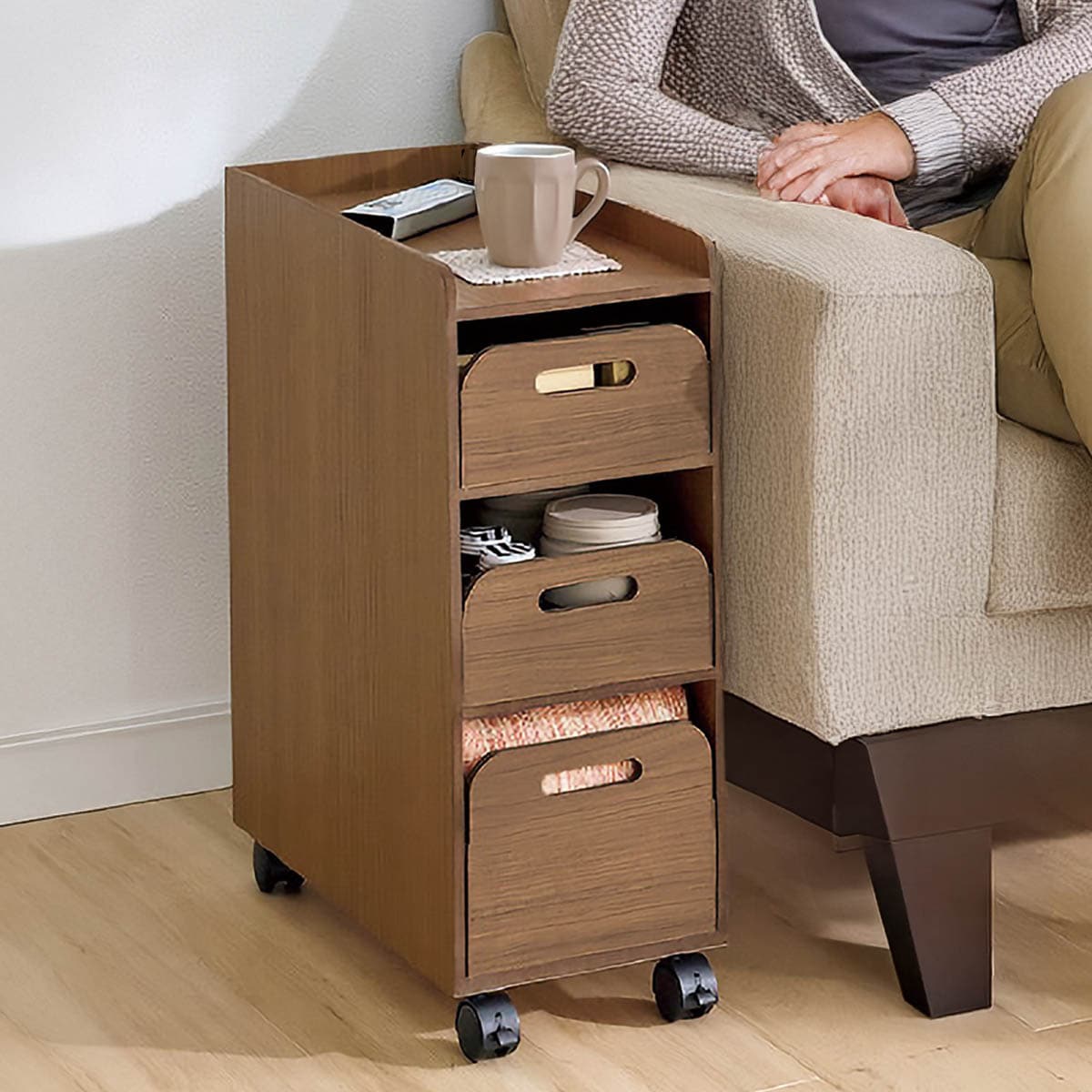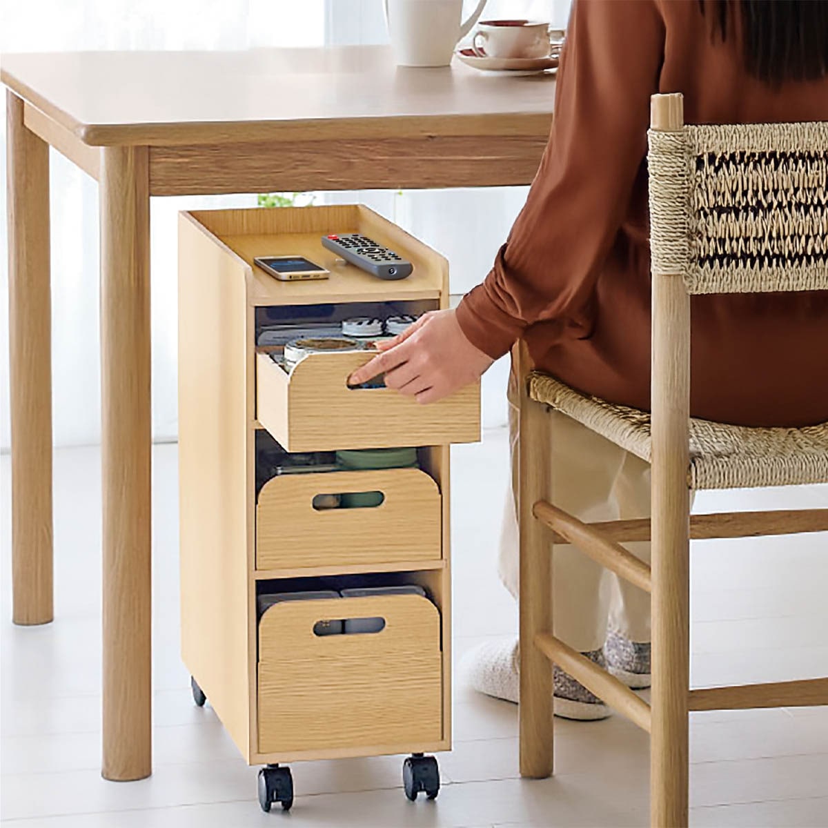 すっきりスリムでも充実の収納力!リモコン、メガネ、文具、請求書などついつい出しっぱなしにしてしまうものをひとまとめに収納できます。上・中・下の3段に取っ手付きのトレー収納があり、全段取り外し可能なので持ち運びにも便利です。引き出し内は3枚のの仕切り板付き。浅型(2個)と深型(1個)があるので、収納物に合わせて入れる場所を調整できるのも嬉しいポイント。ダイニングテーブル下に収まるコンパクトサイズ。天板にはよく使うものをちょい置き出来るのでソファやベッドサイドにもピッタリ。キャスター付きで移動もラクラク