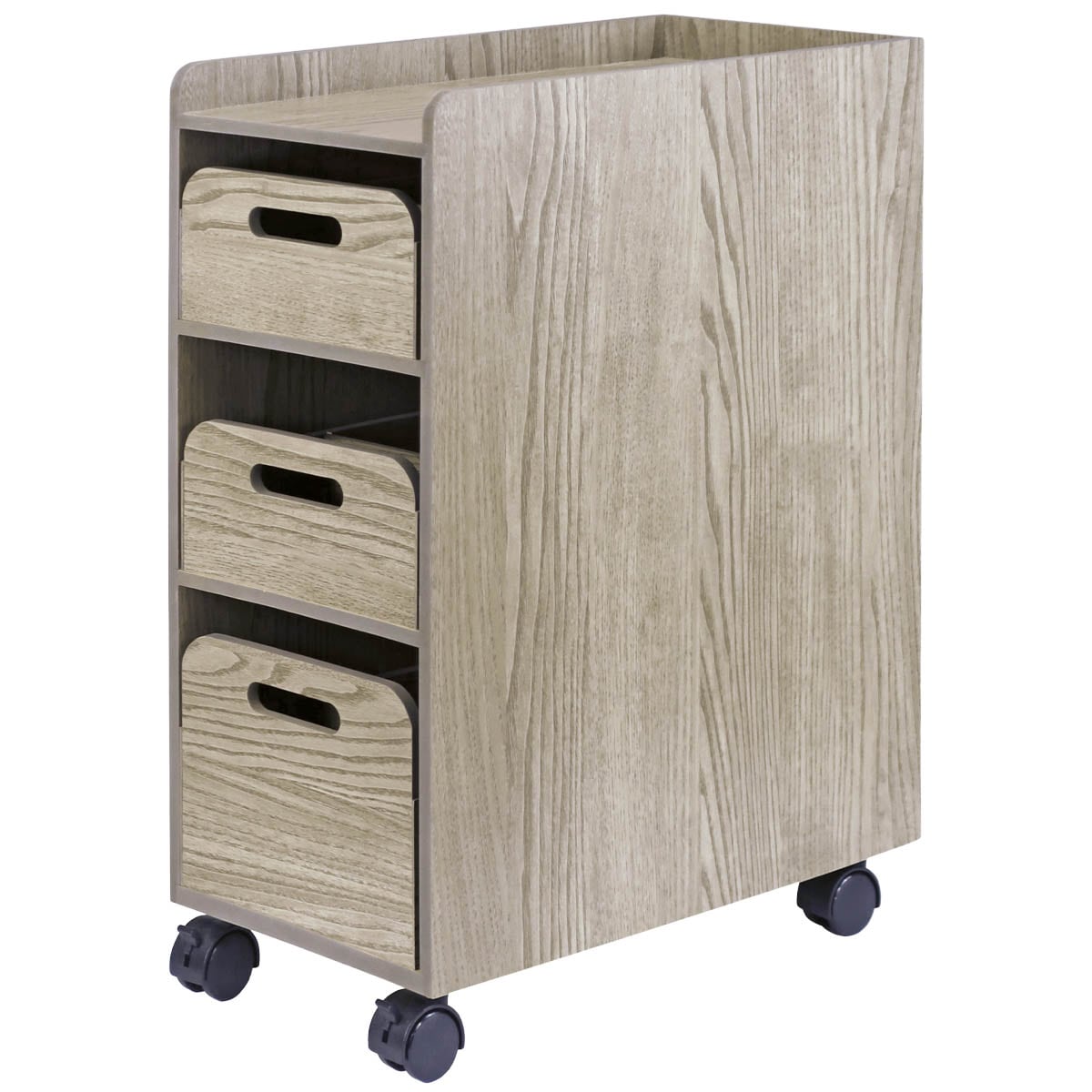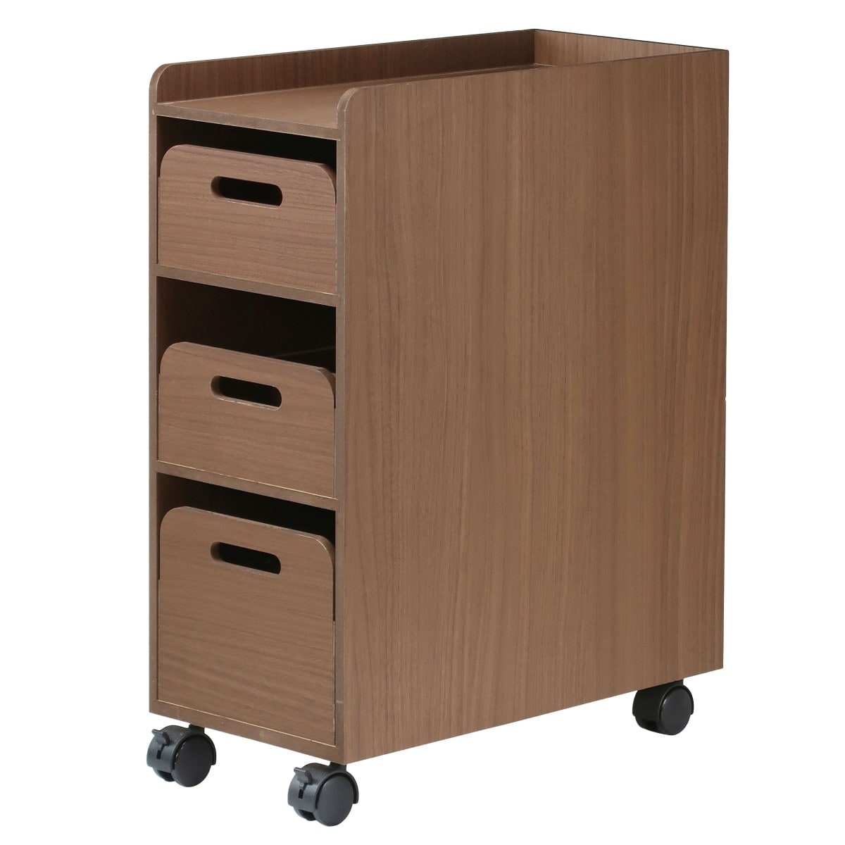 散らかりがちな小物をひとまとめに!テーブル下に入れても邪魔になりにくいスリムタイプのワゴンです。ちょい置きに便利な天板と持ち運び可能な3段のトレー付ですっきり収納できます。