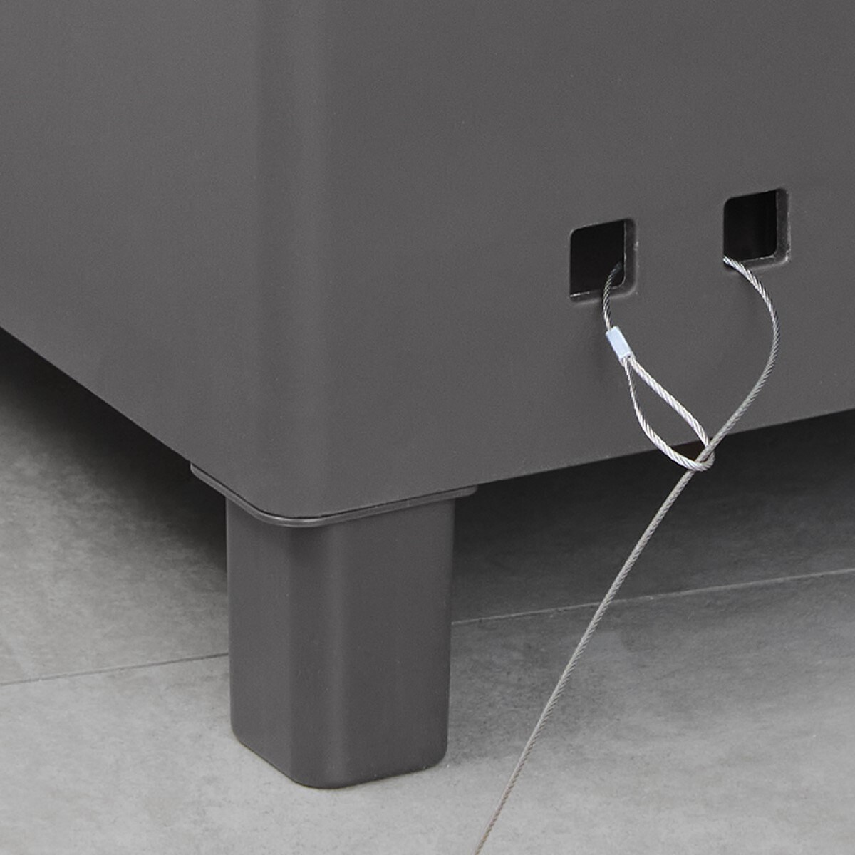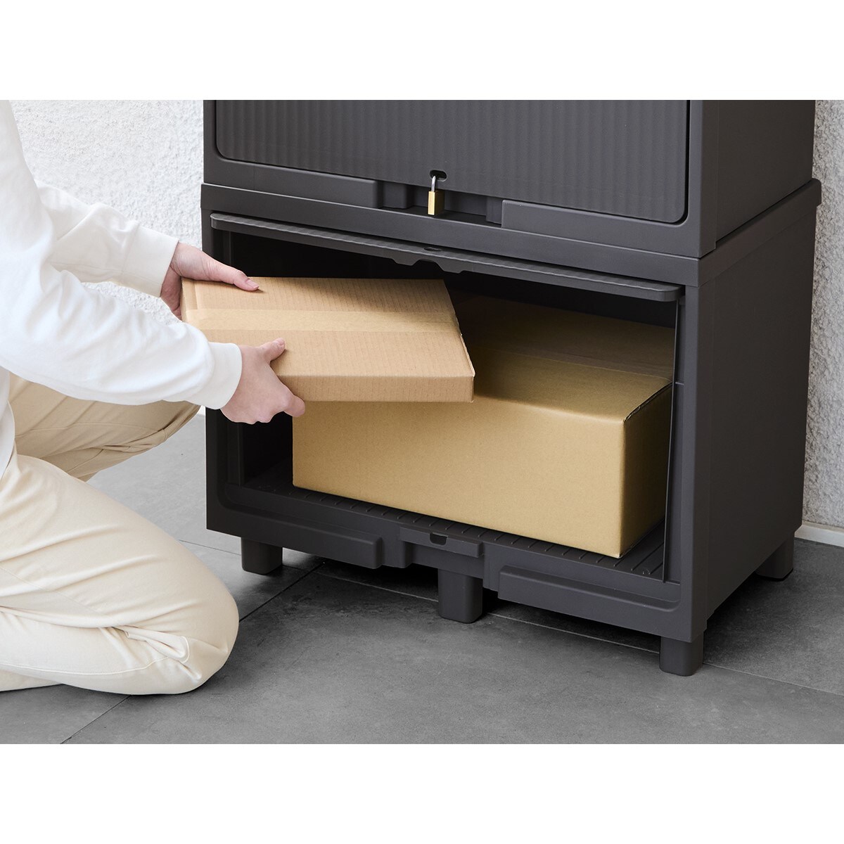 工具不要で組立簡単!女性でも手軽に設置できます。頑丈でサビにくい樹脂製なので、安心して屋外でもご使用いただけます。国際規格IPX2に相当する防水機能で、水の侵入をしっかりガード!大切な荷物を守ります。■[本体]ポリプロピレン[補強板]アルミ ■サイズ:(約cm)/幅60×奥行37×47(脚あり)41(脚なし)■製品重量/約3.2kg ■容量/58L ■最大受取サイズ(約cm)/幅46×奥行33×高さ29 ■耐荷重(約kg)/最下段:15 2段目以降:5 天板:5 ※積み重ねは3段まで可能●日本製【簡易組立式】