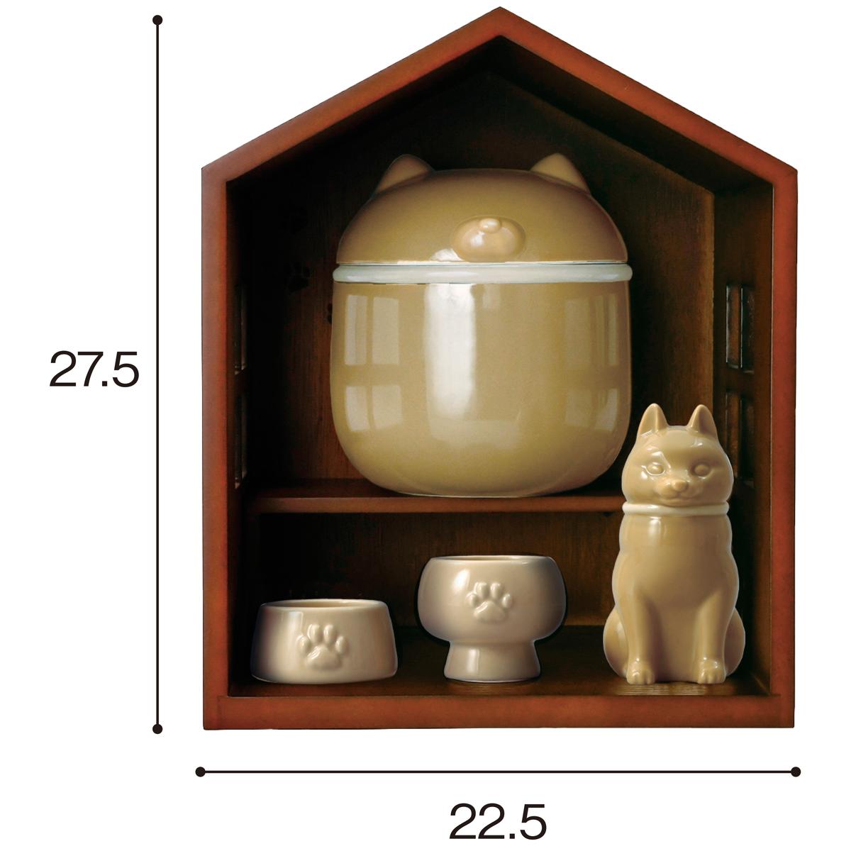 ■[ハウス型仏壇]MDF[骨壺・仏具セット]陶器 ■サイズ(約cm)/本体:幅22.5×奥行21.2×高さ27.5 台:幅20.2×奥行9.8×高さ6.5 ■製品重量/約2550g(全てセットした状態) ※素材の特性上、サイズ・重量・木目の出方が異なる可能性があります。※陶器は個体により、小さい黒点・釉だれなどが出る場合があります。●中国製【完成品】 【小型別配送】