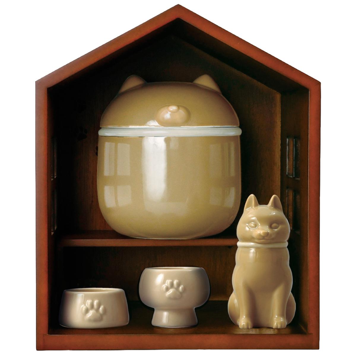 大切なペットをいつでもそばで見守れる。おしゃれなおうち型の仏壇です。シンプルで木目がオシャレなので、お部屋に馴染みやすいのがポイント。犬・猫モチーフの花瓶とお供え物入れ、骨壺がセットに。届いたその日から手元供物を始められます。
