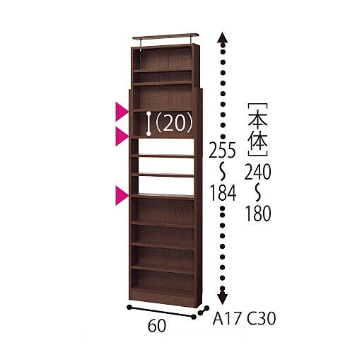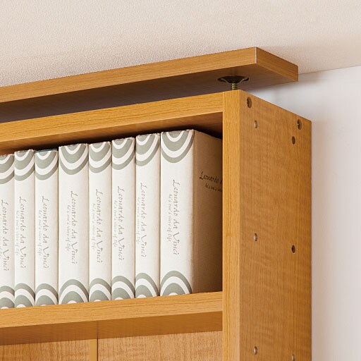 • 本体の上棚部分がそのまま上下するしくみ。天井いっぱいまで本棚スペースを拡張することができます。<br>※このカラーは完売しました。