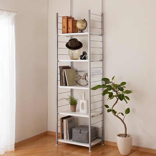 天井突っ張り式でしっかり固定。棚は可動式(10cmピッチ)で日用品や食品のストック棚としても活躍します。