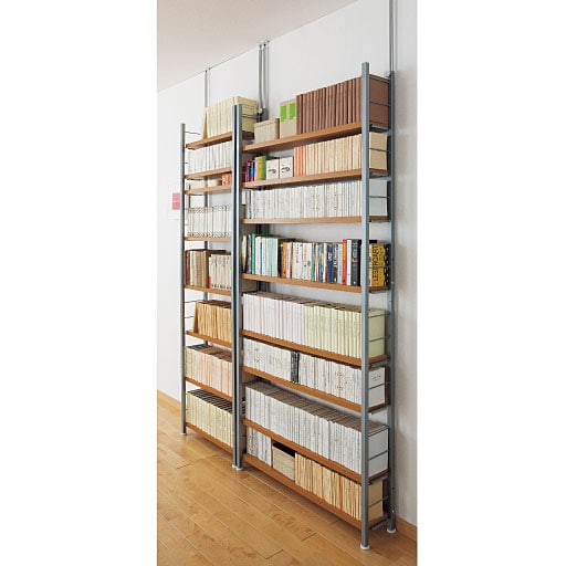 突っ張り式の安心タイプ書棚。木棚とスチールのフレームの組み合わせ! 設置場所や収納量に合わせて、奥行と幅を選べます。