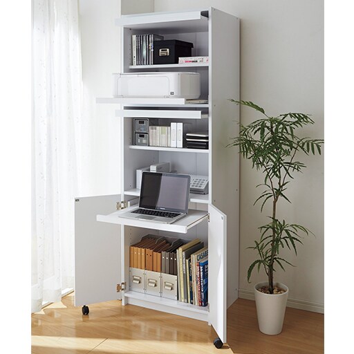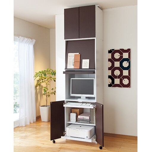 省スペースにパソコン関連商品をすべてまとめて収納できます。高さがあるので、省スペースにパソコン本体やモニター周辺機器をまとめて収納できます。開閉しやすいフラップ扉で、来客時にはサッと閉じてお部屋すっきり。