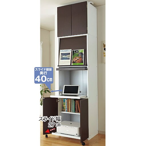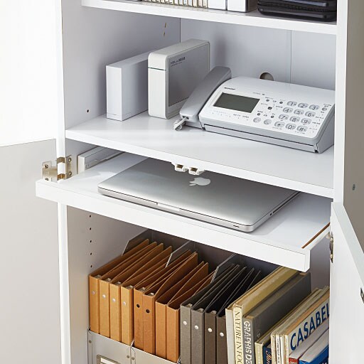 スライド棚板はノートパソコンや、デスクトップタイプのキーボード置き場に便利。