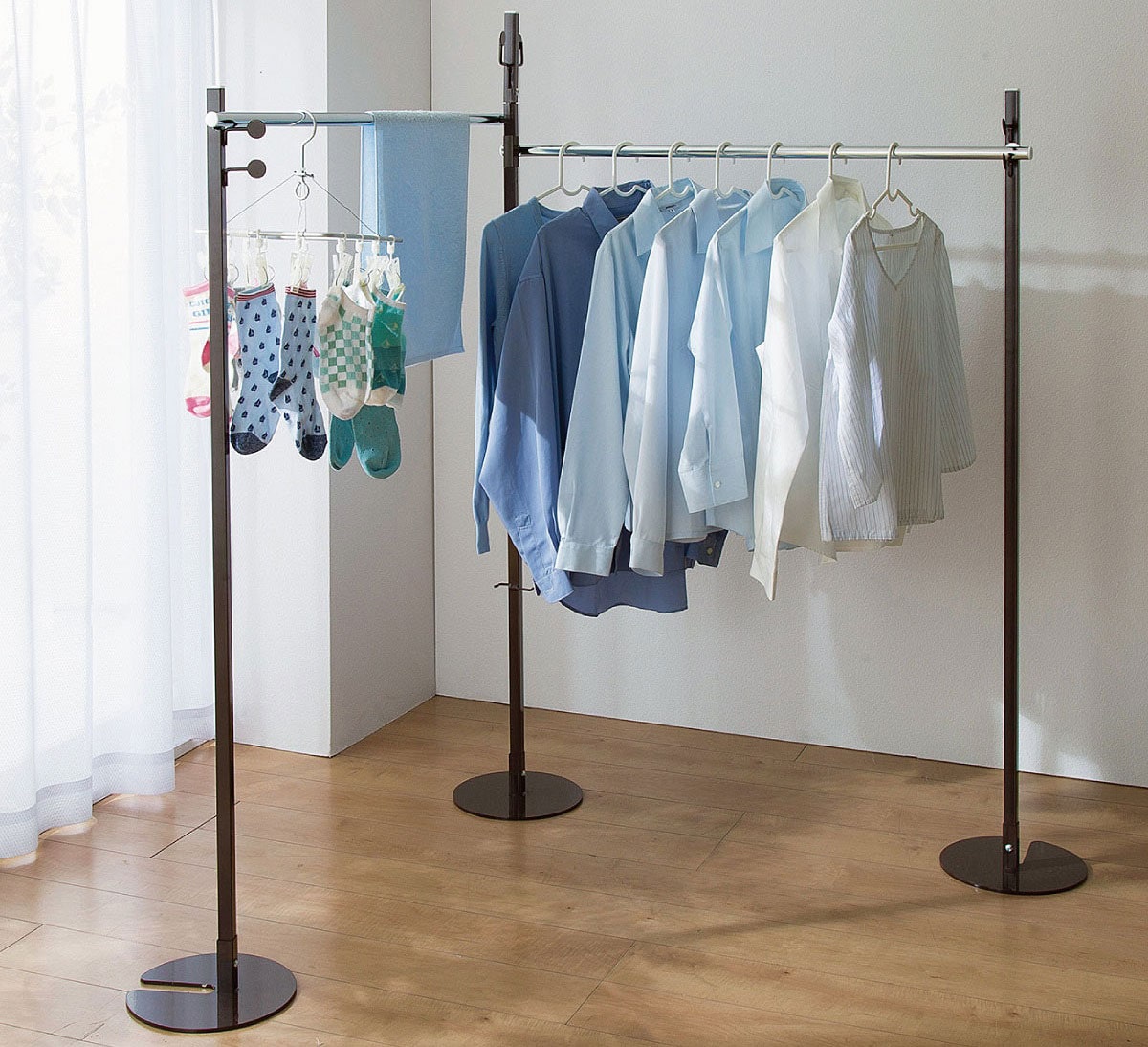 ハンガーバーを広げて物干しに!足を重ねてポールハンガーに!