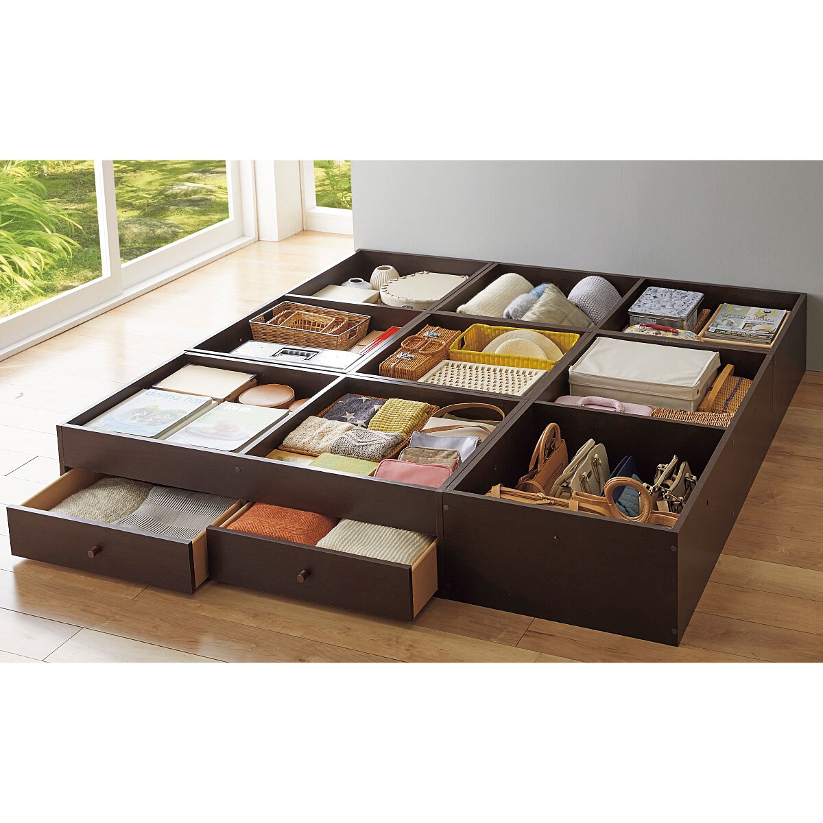 ブラウン(ロータイプ) A (幅60cm)×1・B (幅120cm)×3・C (幅120cm/引き出し)×1畳を開けると、大容量の収納庫に。ボルト連結でしっかり固定できます。