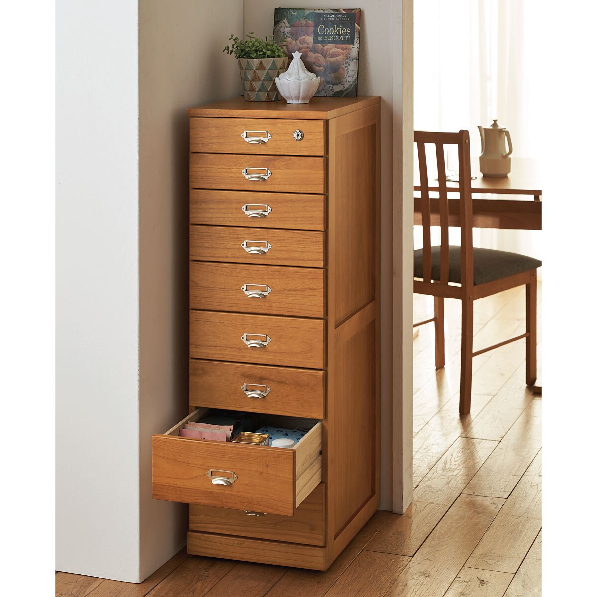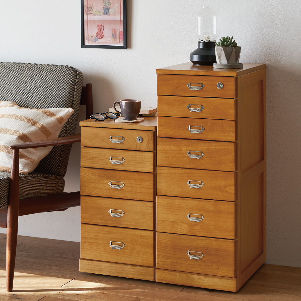 【完成品】プリントや手紙、文房具、常備薬など散らかりがちな小物をすっきりとしまえる家具調の収納チェストです。大切なものは上部の鍵付き引出しへ。キャスター付きなので掃除をする時も便利。小さなサイズはデスクの下でも重宝します。