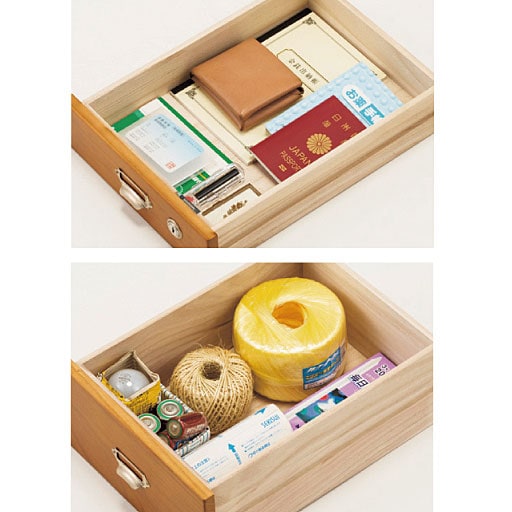下部は深型、最上段は鍵付き引き出しで収納物ごとに使い分けができます。