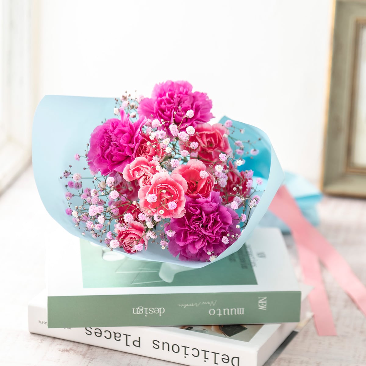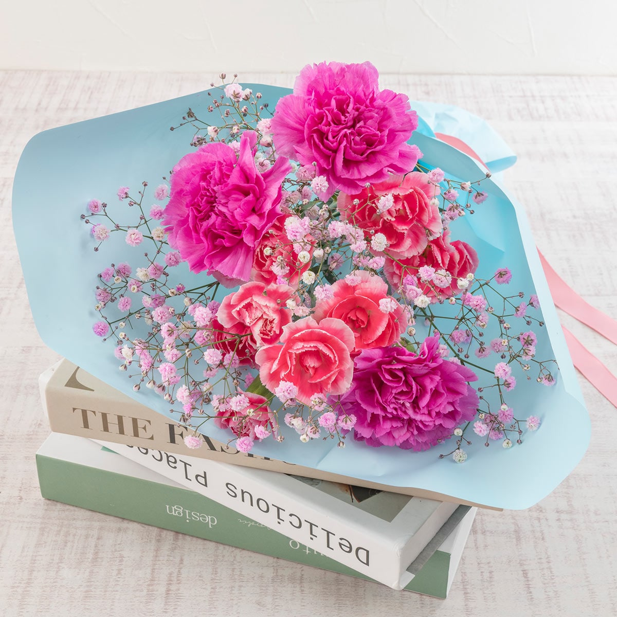 ■カーネーション(濃いピンク×3)、スプレーカーネーション(複色ピンクホワイト×2)、カスミソウ×1、ラッピング、リボン、母の日カード、お手入れのしおり