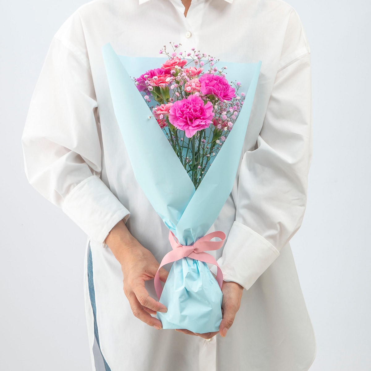 • ソーダカラーのラッピングにピンクに染め上げたカスミソウが映える、ピンクと水色のコントラストが可愛い花束です。
