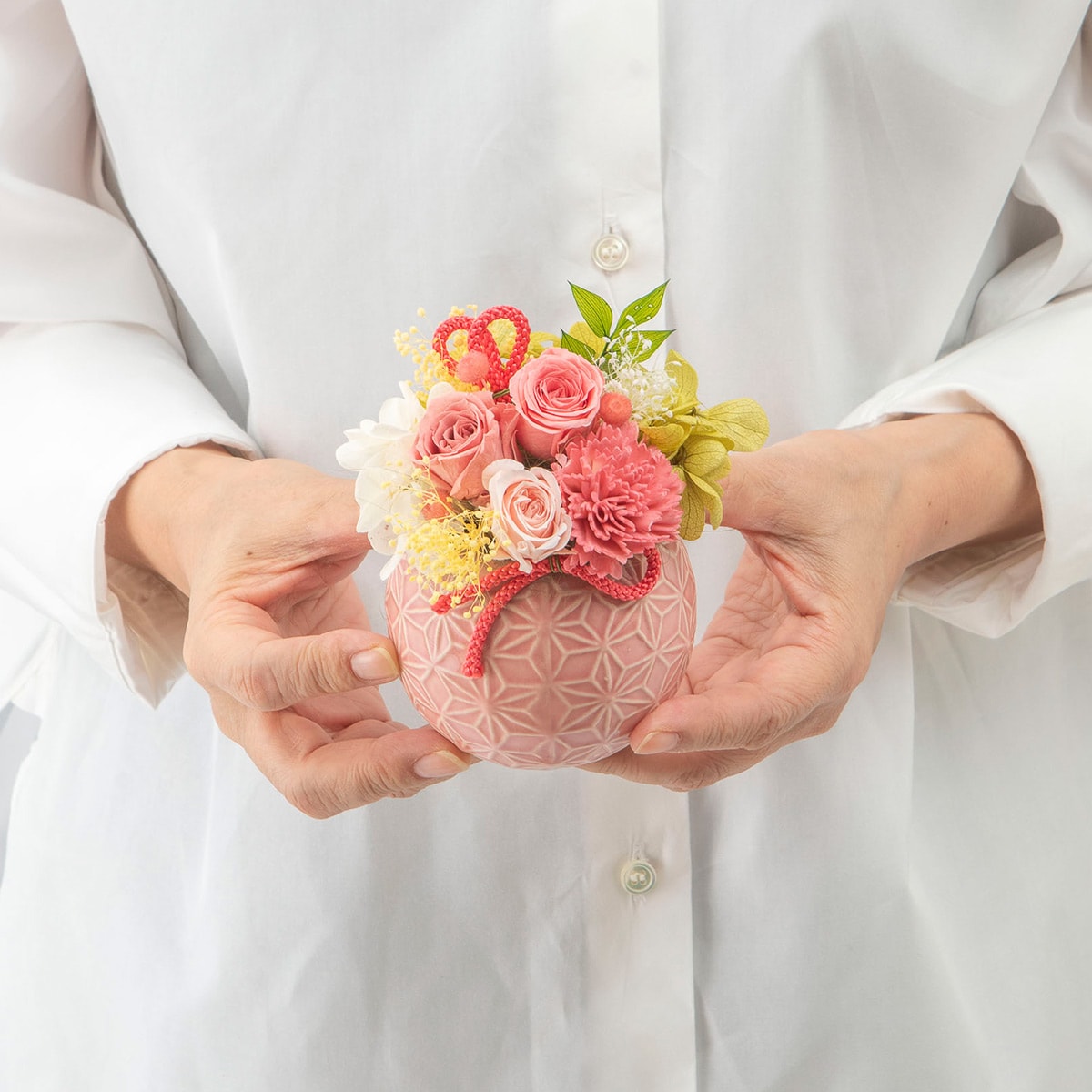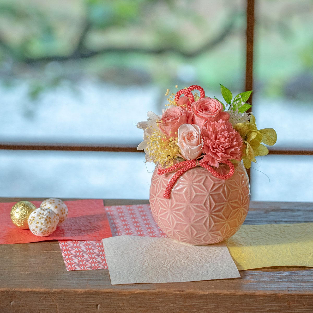 和風テイストを取り入れたころんとしたフォルムが可愛い、優しい気持ち溢れるプリザーブドフラワーアレンジメントです。