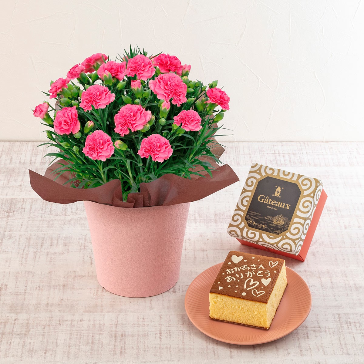 カーネーション(ピンク)の鉢植えとありがとうの気持ち伝わるメッセージ入りカステラのセット。【お届け】2026年5月6日(水)~5月10日(日)の期間にお届けします。