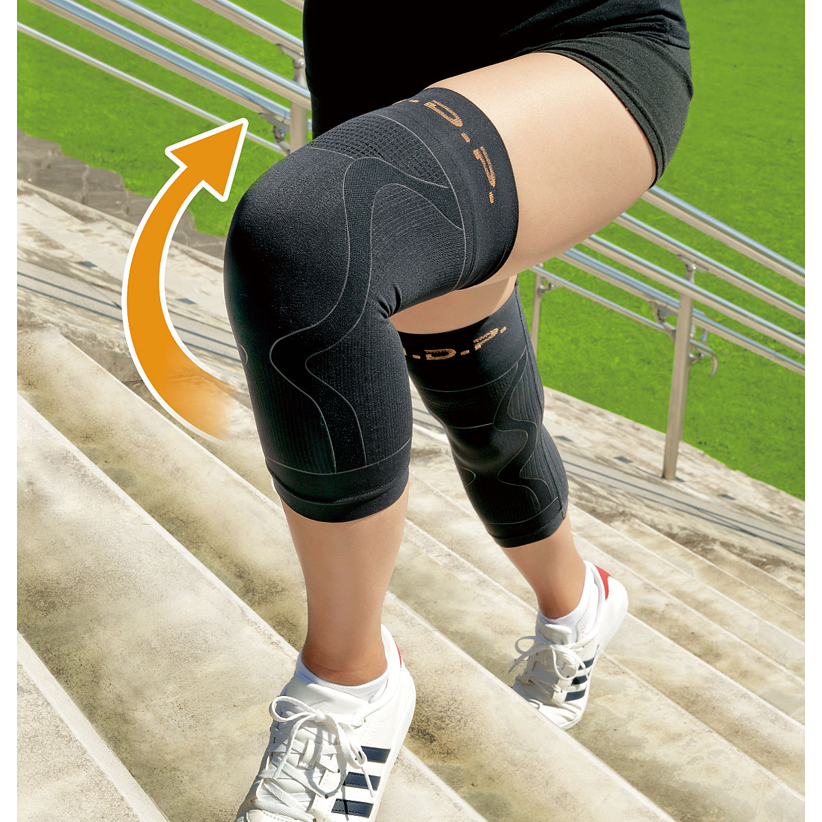 ツラ~いひざが足取りスイスイ!薄さわずか約1mm。ひざ頭の上下左右を安定。ひざ周りの筋肉の動きをサポートし、曲げ伸ばしを楽に。