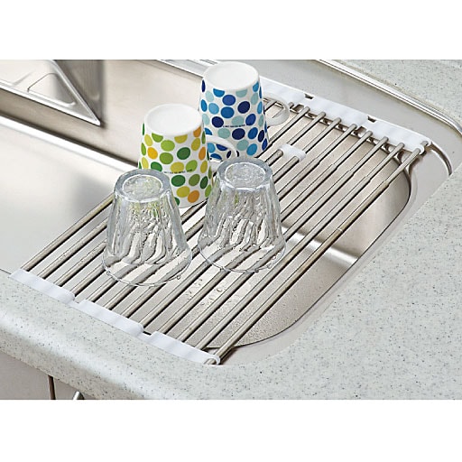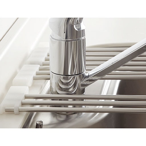 縦も横も伸びて、様々なサイズに変身! 蛇口を避けて設置することもできます。落下防止のシリコンゴムストッパー付き。使わない時は折りたためばコンパクトに収納できます。本体は、伸縮式でどんな奥行のシンクでも大抵のサイズは対応します。また、切り離しや連結が可能なので、お好みの大きさ(幅)でご使用いただけます。