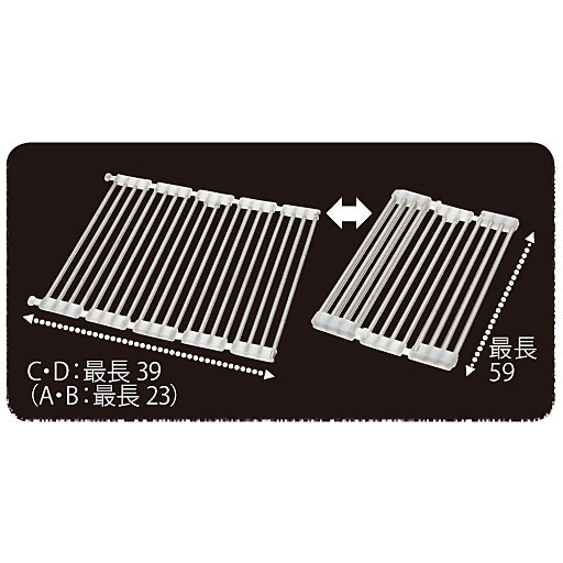 D(クリアワイドタイプ)水切り本体(A~D)は縦も横も伸びて、様々なサイズに変身!横(幅)は最長39cmまで広がる。(C・Dワイドタイプ)縦(奥行)は最長59cmまで伸びる。(A~D共通)※寸法の単位はcmです。