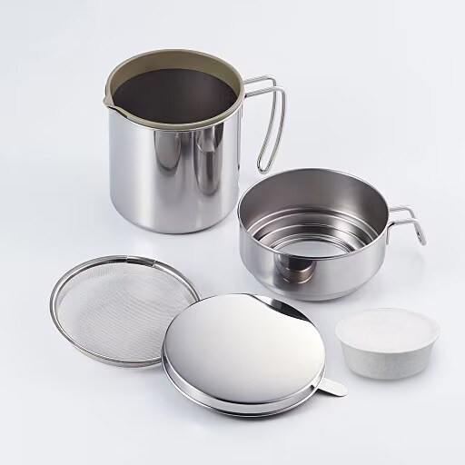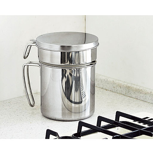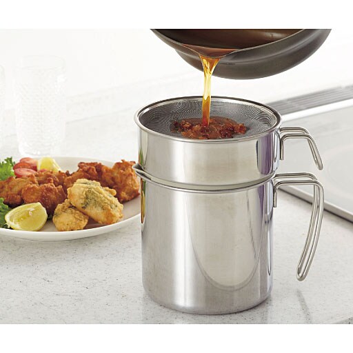 使い終わった油を一度にこせるオイルポット。約800mlの大容量の目皿により、一気に油を流し込めるようになりました。揚げ物をもっと時短で身近な料理に。
