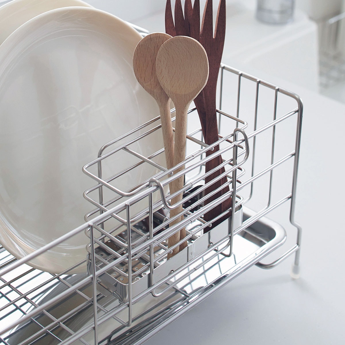 E(箸立て)カトラリーもスッキリ収納水切りかごの内側に掛けての使用もOK。底はスライドして外せるから洗いやすい!