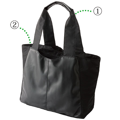 ■素材/[本体]ナイロン100% [切り替え]合成皮革 [防水布]ポリエステル100% ■サイズ(約cm)/縦29×横33×マチ12.5 [持ち手高さ]20 [開口部]40 ■重量/約270g ■仕様/[開閉]ファスナー式 [内側]オープンポケット×2、ファスナーポケット×1 [外側]前面:オープンポケット×1(内側にオープンポケット×2) 後面:オープンポケット×1 底面:ファスナーポケット×1●中国製※後面には合成皮革の切り替えはありません。