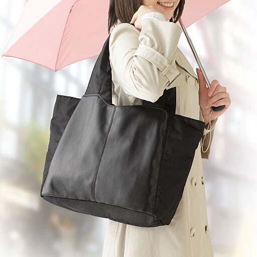 大きく開いて中が見やすく、A4ファイルもすっぽり入る多機能バッグ。計8個のポケットでたっぷり収納でき整理しやすい。ーデザインー内側は中が見やすい明るいブルー。ー素材特徴ー表面に撥水加工を施し雨の日にも安心。収納内部には防水生地を使用し、底部に傘が入ります。※折りたたみ時の長さが28cm以上の傘は収納できません。