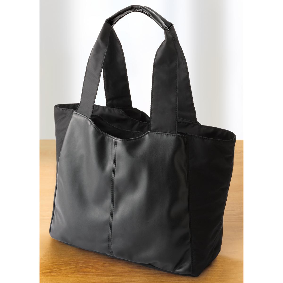■素材/[本体]ナイロン100% [切り替え]合成皮革 [防水布]ポリエステル100% ■サイズ(約cm)/縦29×横33×マチ12.5 [持ち手高さ]20 [開口部]40 ■重量/約270g ■仕様/[開閉]ファスナー式 [内側]オープンポケット×2、ファスナーポケット×1 [外側]前面:オープンポケット×1(内側にオープンポケット×2) 後面:オープンポケット×1 底面:ファスナーポケット×1●中国製※後面には合成皮革の切り替えはありません。