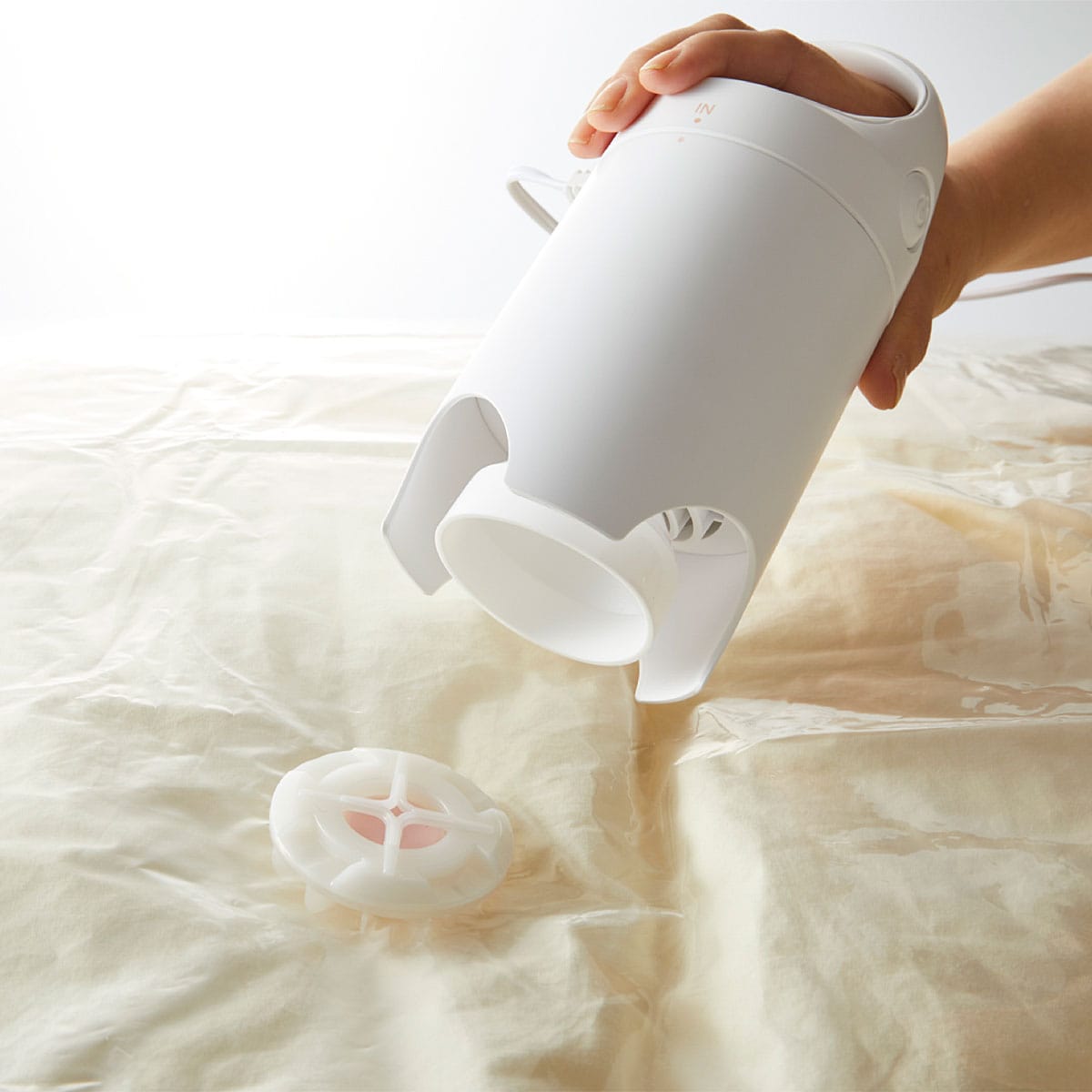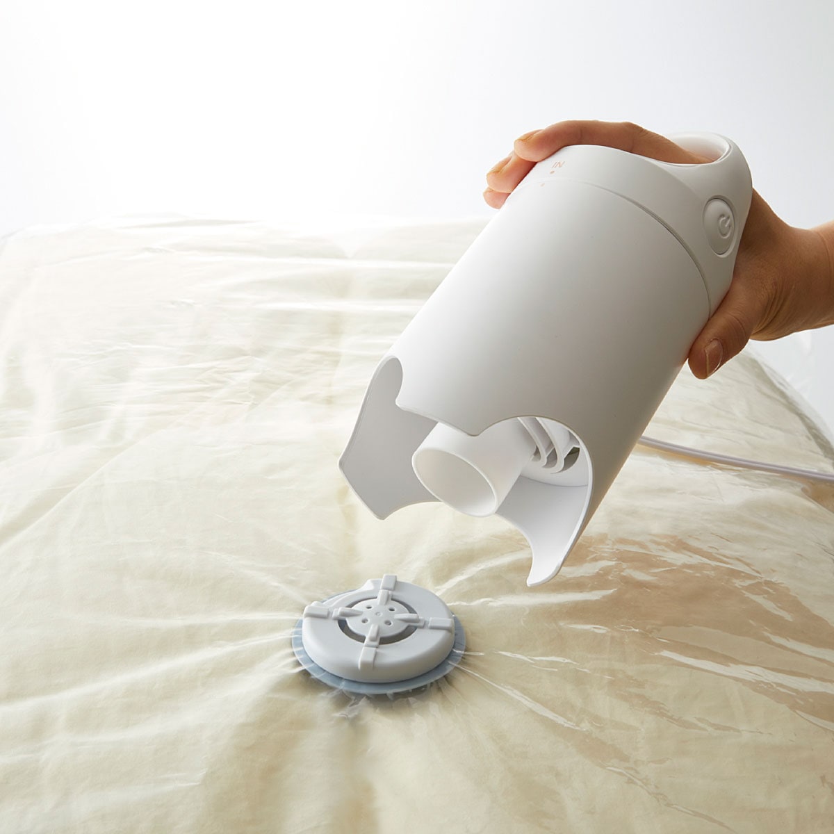 かさばる布団には、やっぱり圧縮収納!専用吸引器を使えば、らくらくスピード圧縮。もう、掃除機の出番はありません!