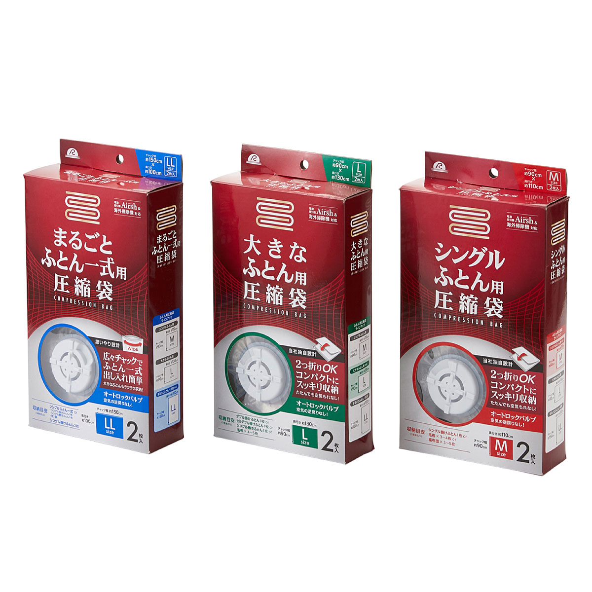 約3分の1の厚みに布団を圧縮できる圧縮袋。シングル、セミダブル、ダブル等、布団のサイズに応じてサイズを選べます。電動吸引機 Airsh(エアッシュ)対応の圧縮袋で、スピード圧縮。
