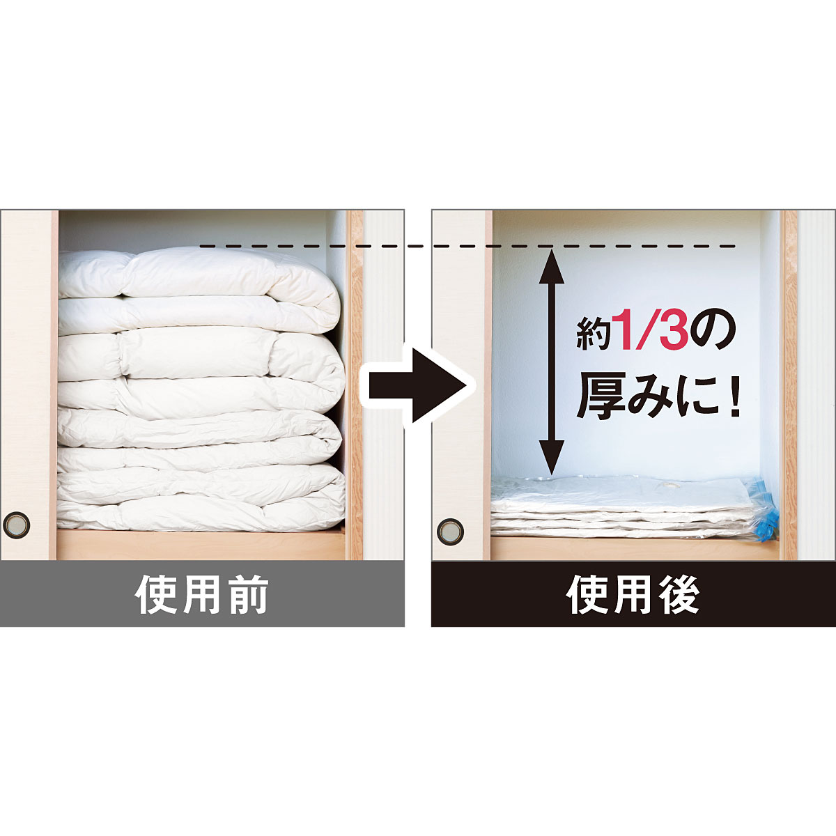 シーズン外や来客用のかさばる布団が約1/3の厚みに!※写真はイメージです。布団の種類や材質により異なります。