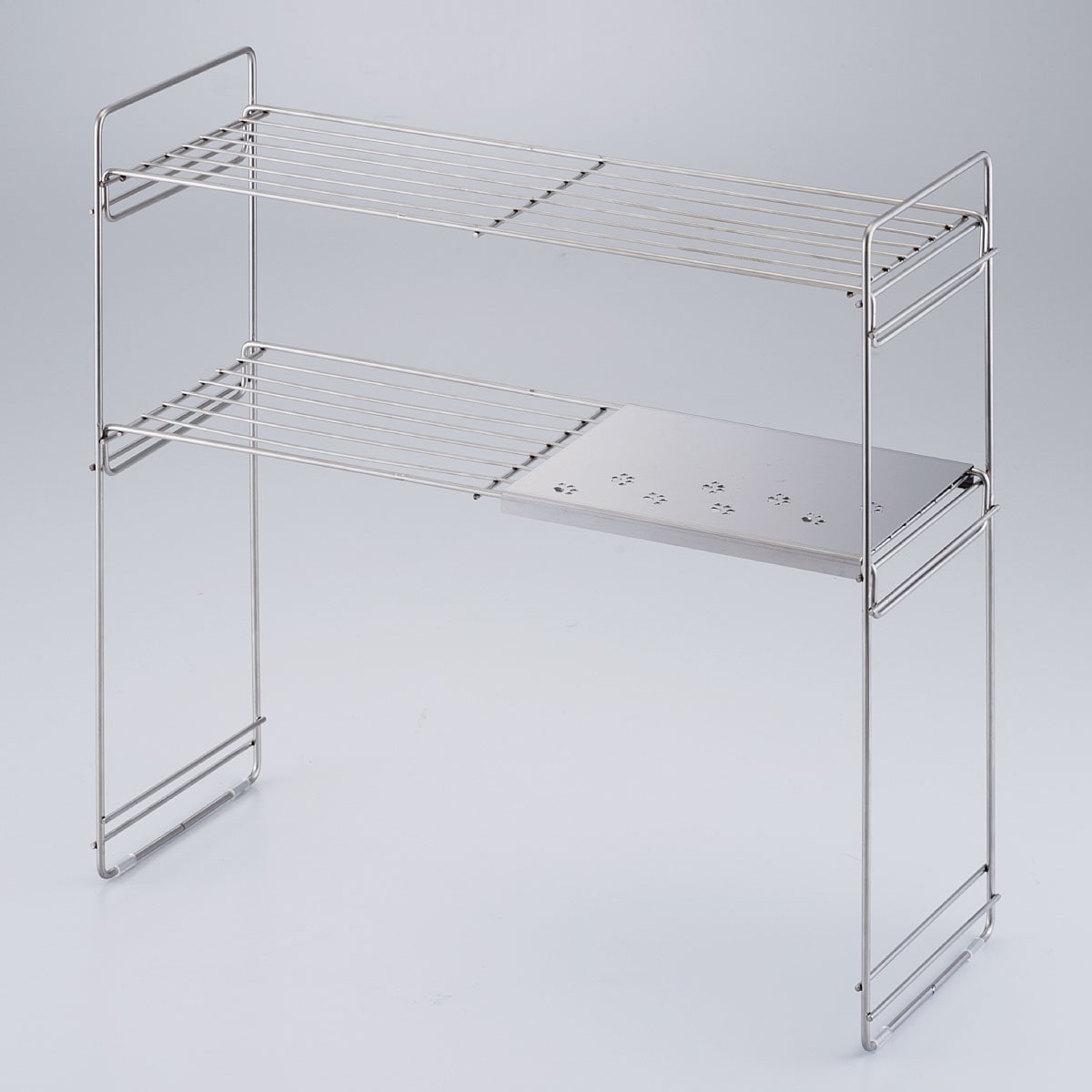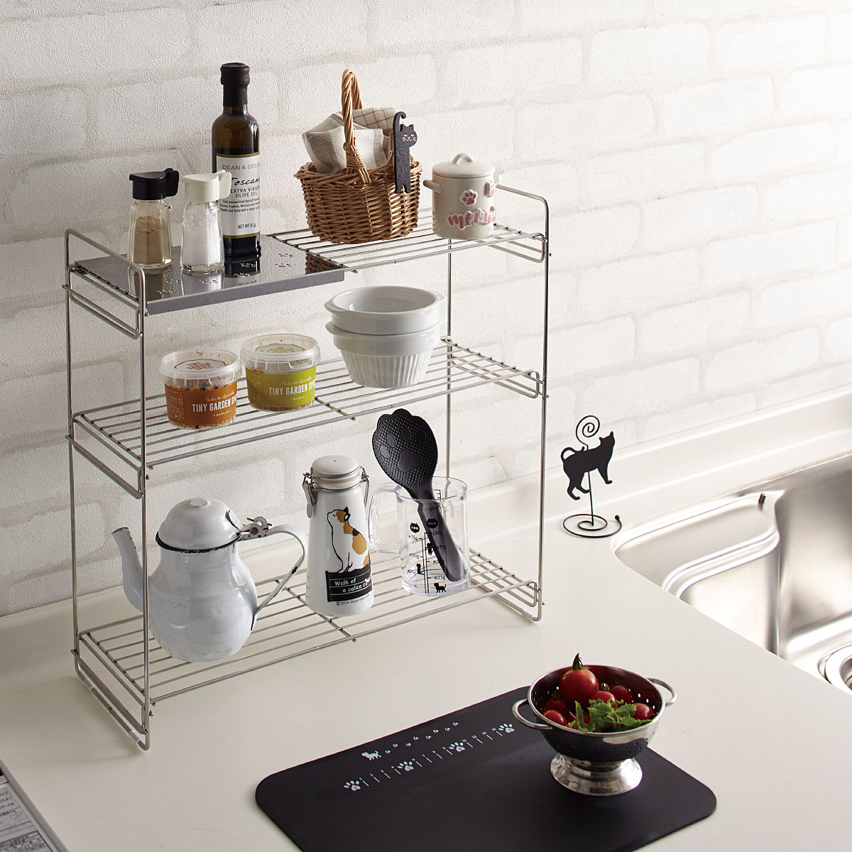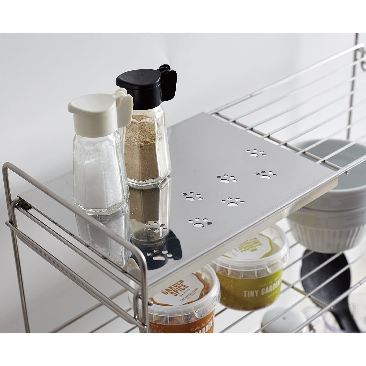 肉球のデザインがさりげなく可愛らしい、ステンレス製のラックです。カウンターや出窓の収納にもおすすめです。